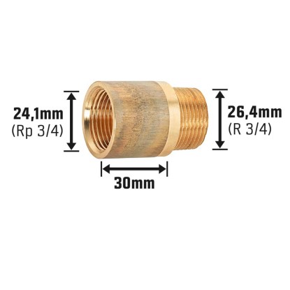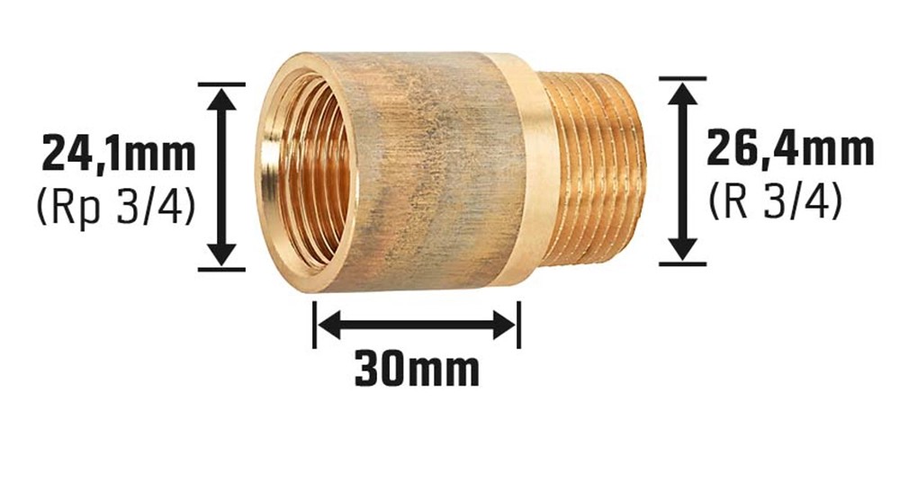 A hasznos és megbízható OBI csaphosszabbító a hideg és meleg vizes vezetékek fektetésekor, valamint a fűtés szerelésekor használatos menetes szerelvény. A csaptelep csatlakozójának hosszabbítására szolgál. A szerelvény egyik oldalán csavaros menettel rendelkezik, melynek belső menete 24,1 mm (Rp 3/4), akárcsak a másik oldalon, ahol a külső menet 26,4 mm-es (R 3/4). A hosszabbító idom mérete 30 mm.