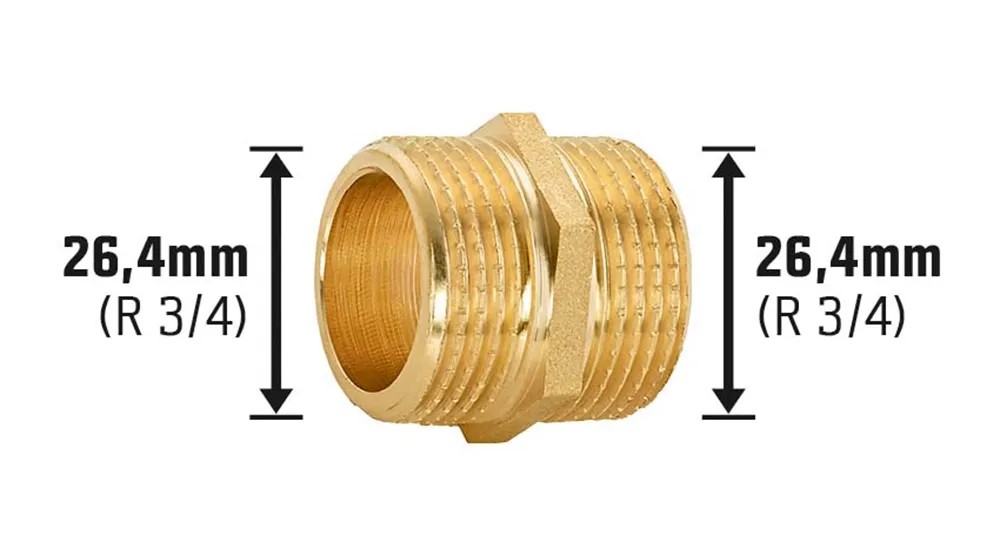 Kettős közcsavar lévén a menetes szerelvény két azonos méretű külső menettel rendelkezik. Mindkét oldal mérete 26,4 mm (3/4"). Könnyedén a csőcsatlakozókra csavarozható. Az ivóvízzel kapcsolatos rendelkezések alapján alkalmazása engedélyezett az ivóvízvezetékek szerelésekor.