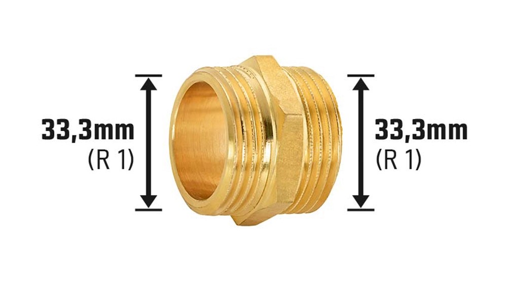 Az erős OBI menetes kettős közcsavarral két cső csatlakoztatható megbízható módon. Ivóvízrendszer és fűtőberendezések csővezetékeinek fektetésekor használatos. A hosszú élettartamú anyag erős és csupasz sárgarézből áll. A menetes szerelvény két azonos külső menettel rendelkezik. A menet mérete 33,3 mm (R 1). Szereléshez könnyedén a csőcsatlakozókra csavarozható. Ivóvíztelepítésre is alkalmazható.
