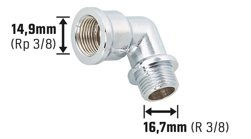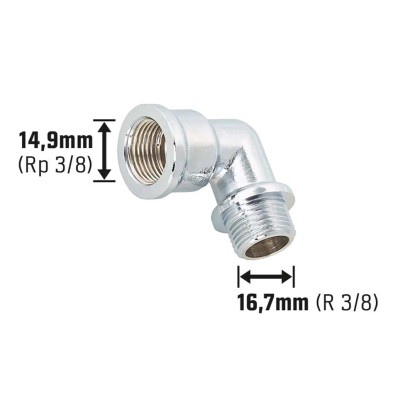 A menetes könyök két cső biztonságos összekötésére használható. Ivóvizes és fűtési berendezések biztonságos beépítéséhez használható. Könyök alakú, ami lehetővé teszi a vezetékrendszer 90 fokos irányváltását. A csatlakozó egy 14,9 mm-es (Rp 3/8) belső menetből, valamint egy 16,7 mm-es (R 3/8) külső menetből áll.