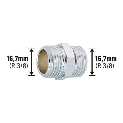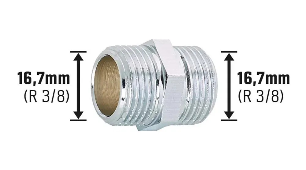 A szerelvény két egyforma külső menettel rendelkezik. A menet mérete 16,7 mm (R 3/8). A csavarzatokkal lehet egyszerűen a csőcsatlakozókra szerelni. Az ivóvízzel kapcsolatos rendelkezések alapján alkalmazása engedélyezett az ivóvízvezetékek szerelésekor.