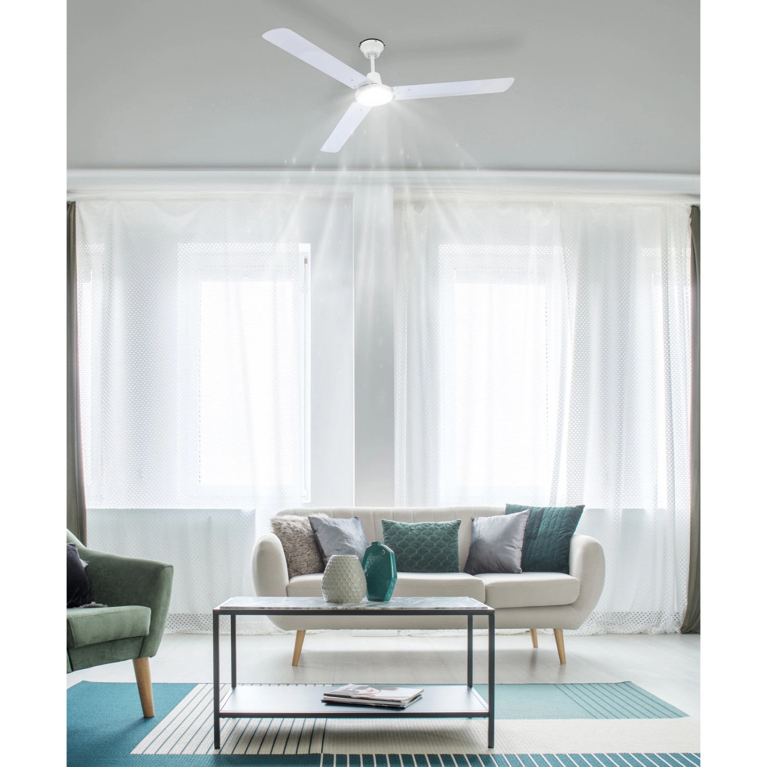 Ventilátor fény nélkül, fém fehér, maximális motorteljesítmény 70W, optimális helykihasználás 30 m2, ø: 1420 mm, H: 580 mm