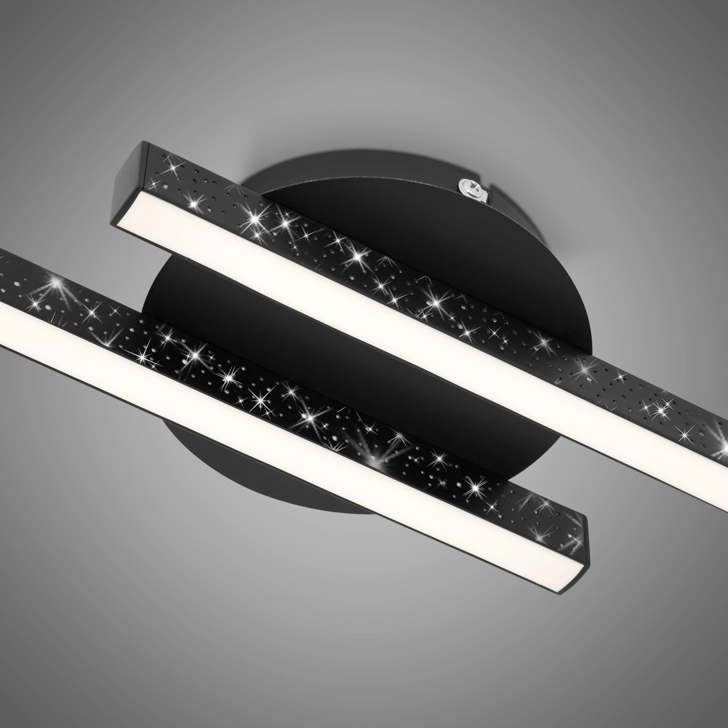 A Rey sorozat 2 izzós Brilo LED mennyezeti lámpája fekete fémből és műanyagból készült, és a lézerlyuk optikának köszönhetően csillogó hatásával minden helyiségben szemet gyönyörködtető látványt teremt. A két LED-rúd egyenletesen osztja el a fényt. Káprázásmentes tulajdonságainak köszönhetően a mennyezeti lámpa különösen hálószobákban, gyerekszobákban, nappalikban és étkezőkben használható.