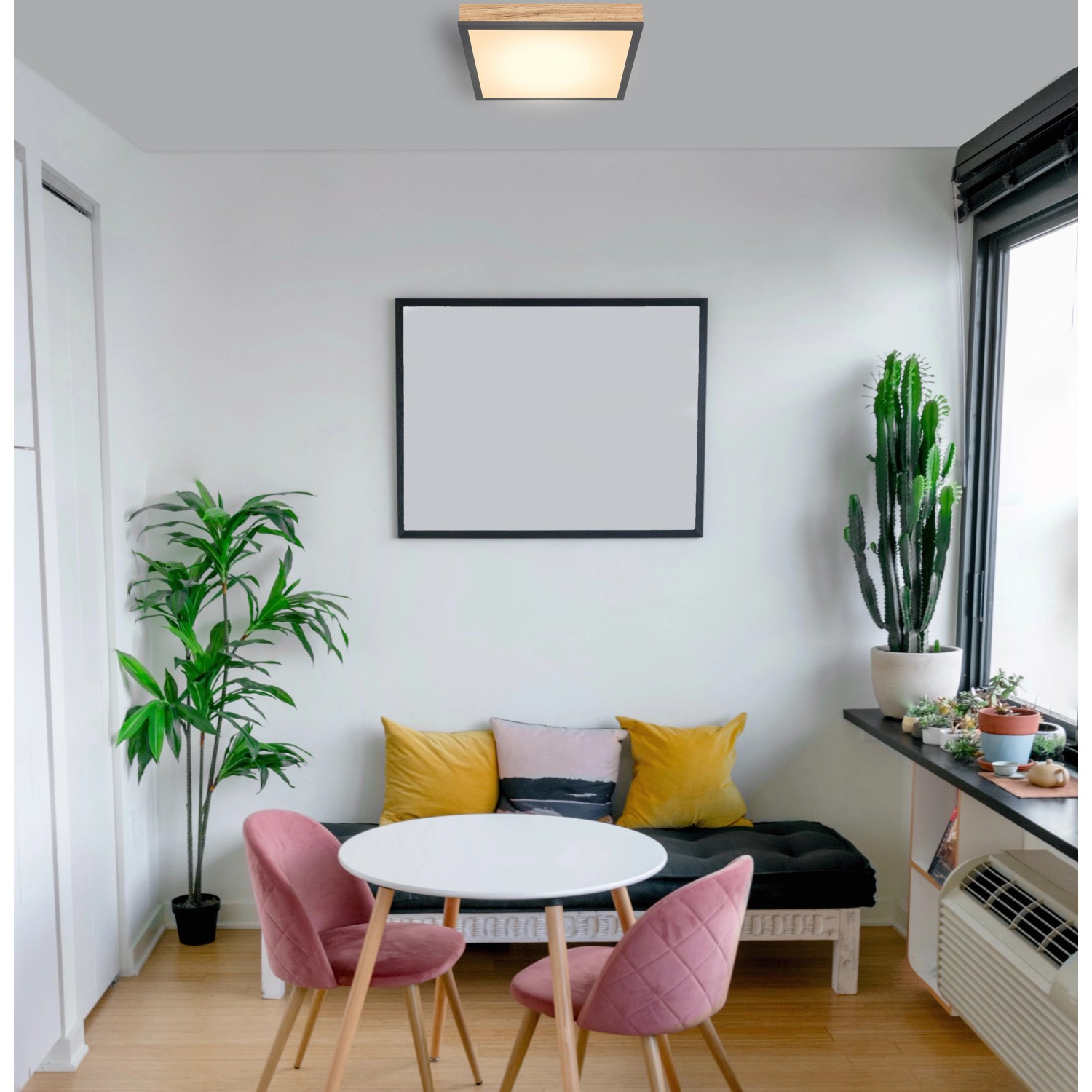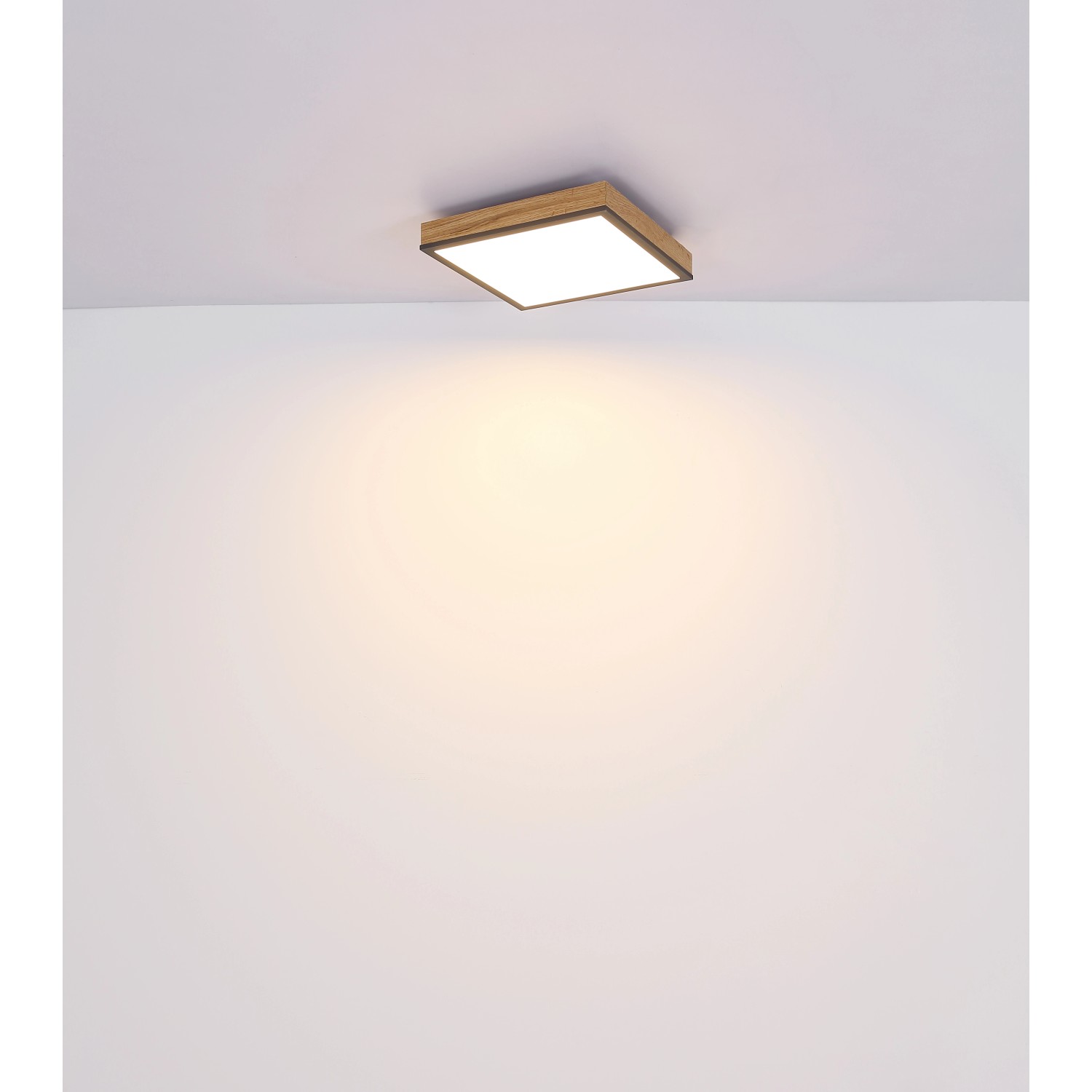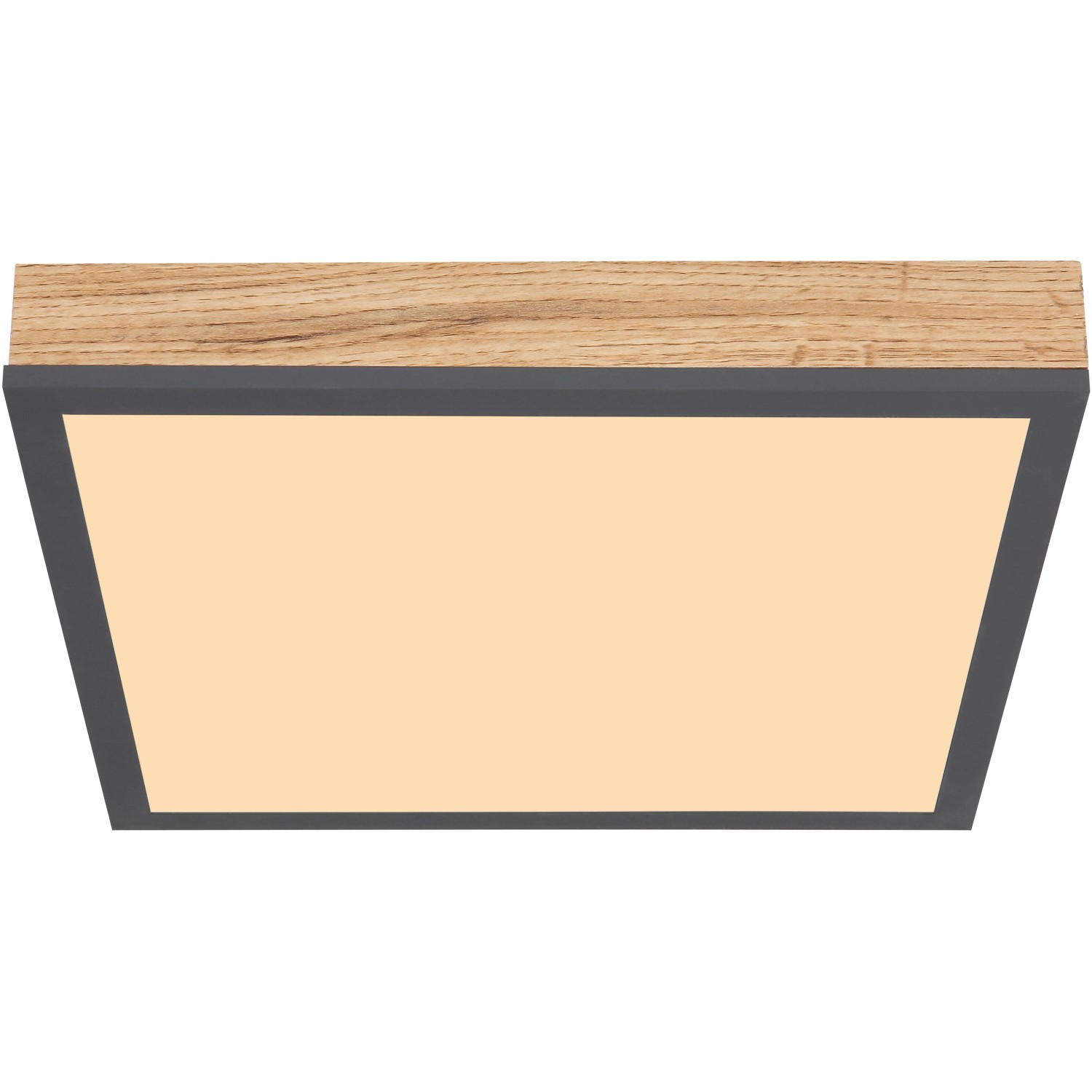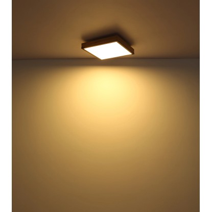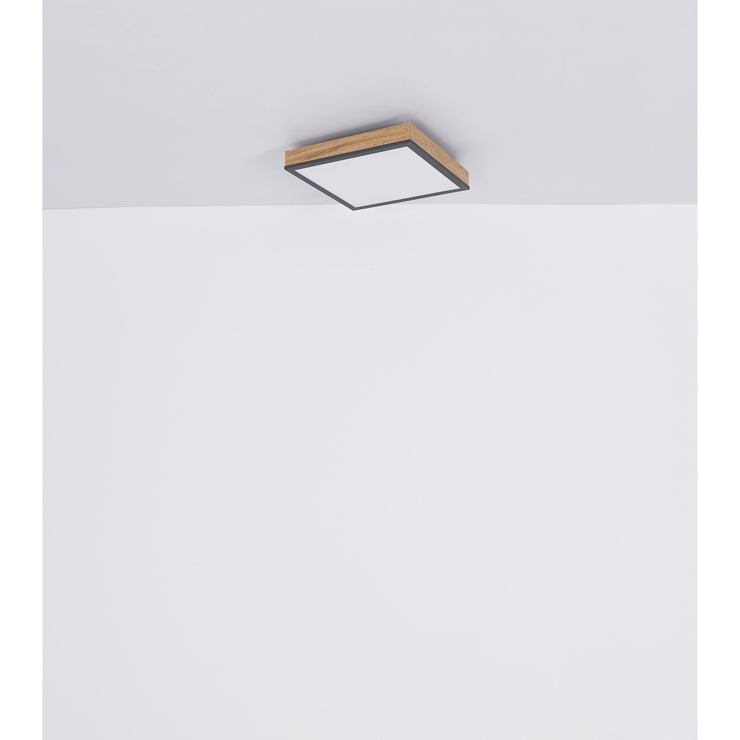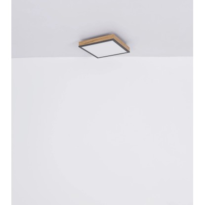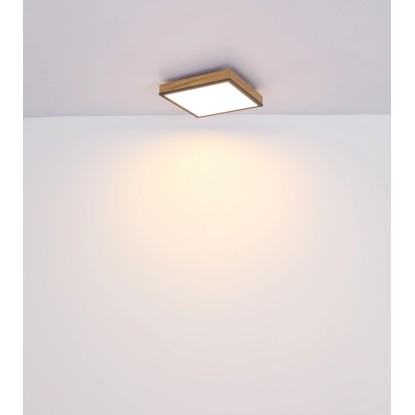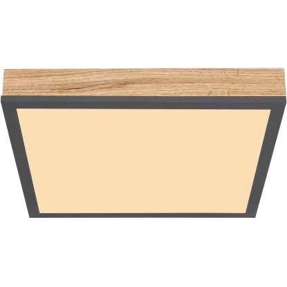 Mennyezeti lámpa fém fehér, grafitszürke, tölgyfa imitáció, akril opál búrával. SZ x H x M: 300 mm x 300 mm x 60 mm, 1 x LED 24 W 230 V, 1500 lm, 3000 K.