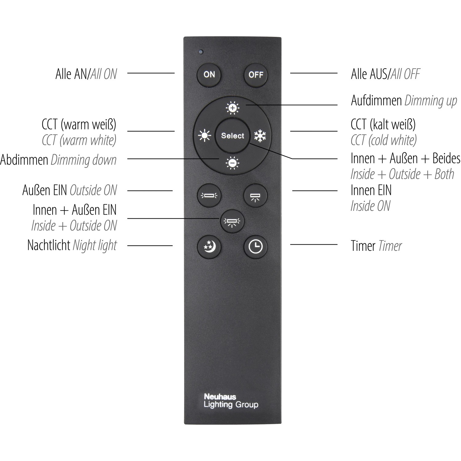 Az Edging sorozat LED-panelje modern és sokoldalúan alkalmazható kialakításával hódít. Az energiatakarékos LED-es mennyezeti lámpa rádió távirányítóval rendelkezik. A beépített CCT fénykezelésnek köszönhetően a fény színhőmérsékletét a melegfehértől (2700 Kelvin) a hidegfehérig (5000 Kelvin) szabályozhatja, így szimulálhatja a nap folyamán előforduló fények színét. A rádiós távirányítóval a fényerősség is szabályozható. A memória funkció elmenti az utoljára használt beállítást. Ezenkívül a mennyezeti lámpa soros kapcsolóval is rendelkezik, amely lehetővé teszi különböző beállítások elvégzését: Amikor először kapcsolja be és ki a panelt, akkor a teljes mennyezeti világítás felragyog. A mennyezeti panel második be- és kikapcsolásakor csak a lámpa külső széle világít, a harmadik be- és kikapcsoláskor pedig csak a mennyezeti lámpa belső része világít. A fehér műanyag felületnek köszönhetően a LED-panel lágy és kellemes fényt ad. A lámpa hosszúsága és szélessége 67,7 cm, felfüggesztése pedig 5,8 cm. Az alkalmazott LED-technológiának köszönhetően a mennyezeti lámpa nemcsak energiatakarékos, hanem hosszú élettartama és alacsony hőtermelése is lenyűgöző.