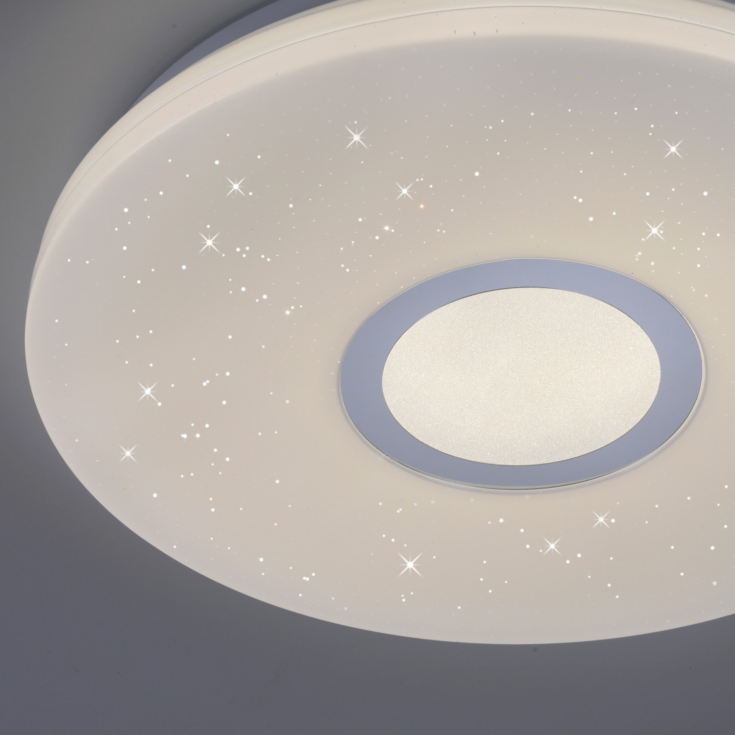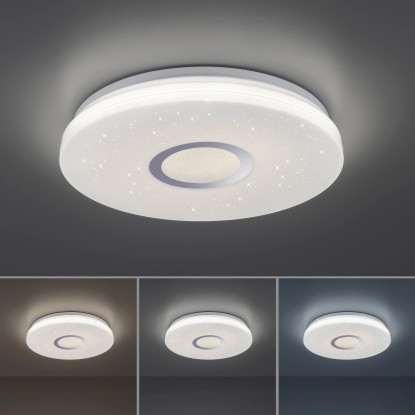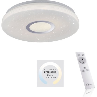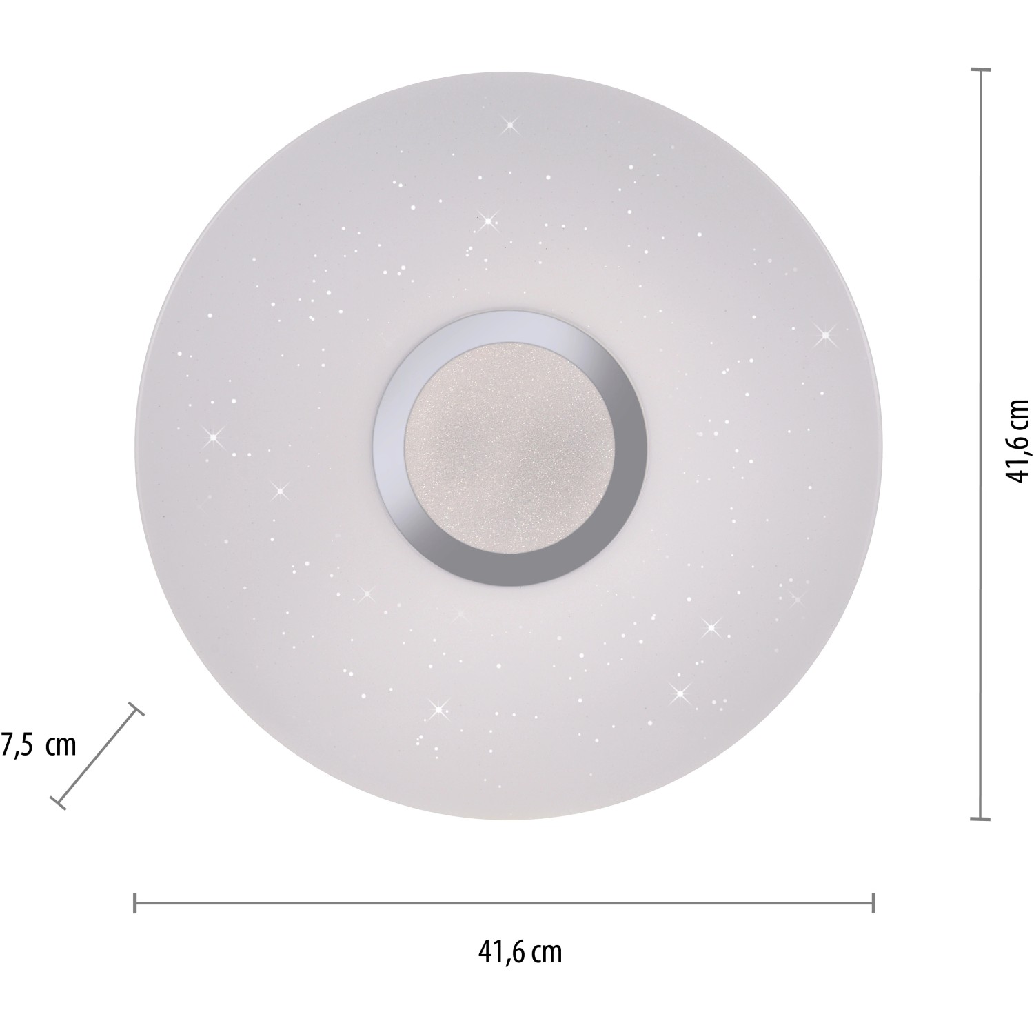 A kerek Jonas mennyezeti lámpa elvarázsol lenyűgöző csillagos égbolt megjelenésével. Képzelje el, hogy egy enyhe nyári estén ül a kertben, az erkélyen vagy egy réten a természetben, és a csillagokat nézi. Milyen megnyugtató, pihentető érzés árad szét az emberben. A nyugalom, a varázslatos látvány. A Jonas mennyezeti lámpával most könnyedén varázsolhat csillagos égboltot otthonába. Acél és műanyag kombinációjából készült, és az üvegbúrában lévő sok kis áttetsző pontnak köszönhetően úgy tűnik, mintha kis csillagok ragyognának. Egy fixen beépített 17,2 W-os LED-izzót tartalmaz. A lámpa mintegy 2420 lumennel világít, és a lámpa fényszínét a melegfehértől (3000 Kelvin) a nappali fehérig (5000 Kelvin), valamint a fényerősséget változtathatja. Ez a szabályozás a lámpa távirányítóval végezhető, amely a csomag részét képezi. A 41,6 cm átmérőjű lámpa sokoldalúan használható és garantáltan különleges helyet talál az egyik lakóhelyiségben. Engedje, hogy elvarázsolja a gyönyörű csillagos égbolt.