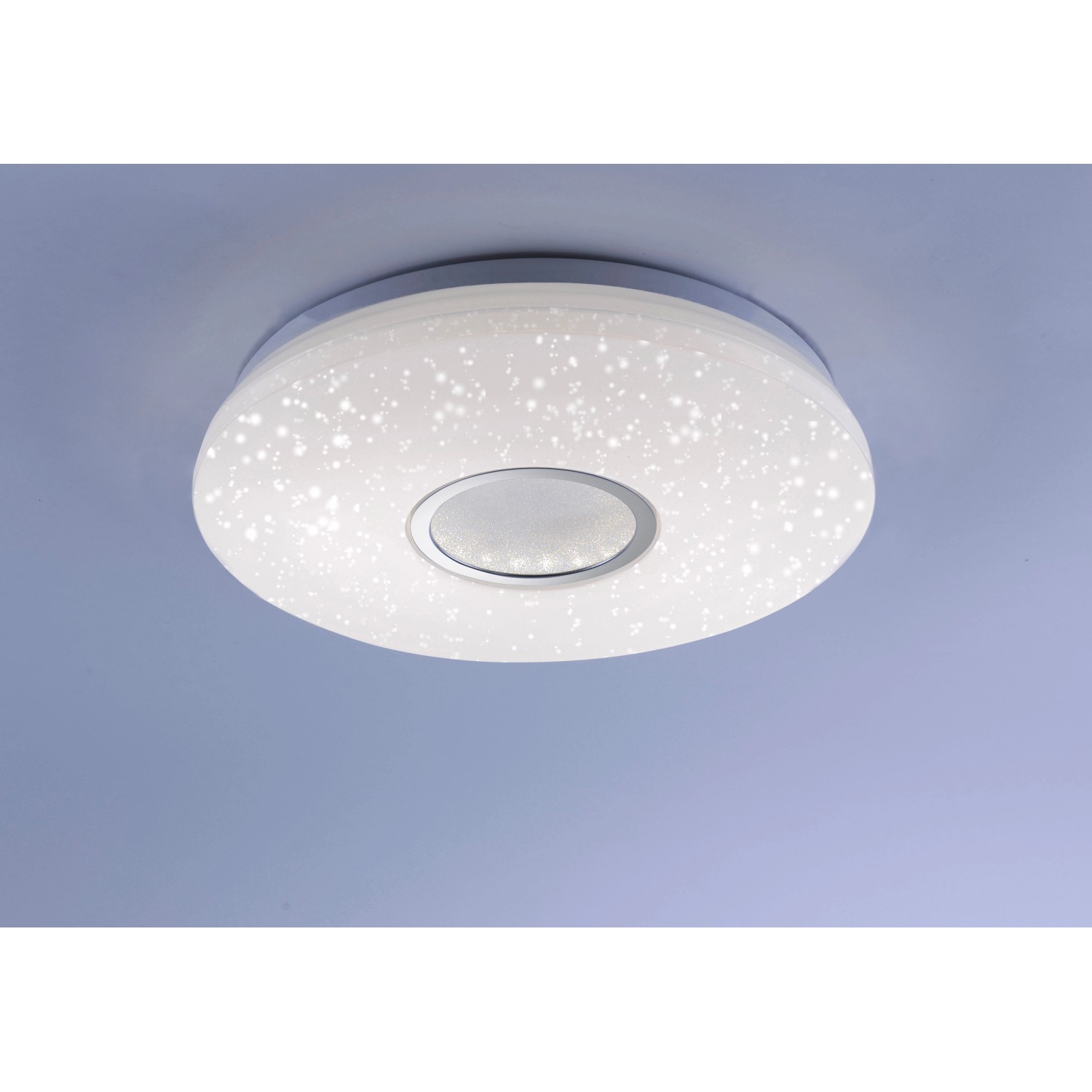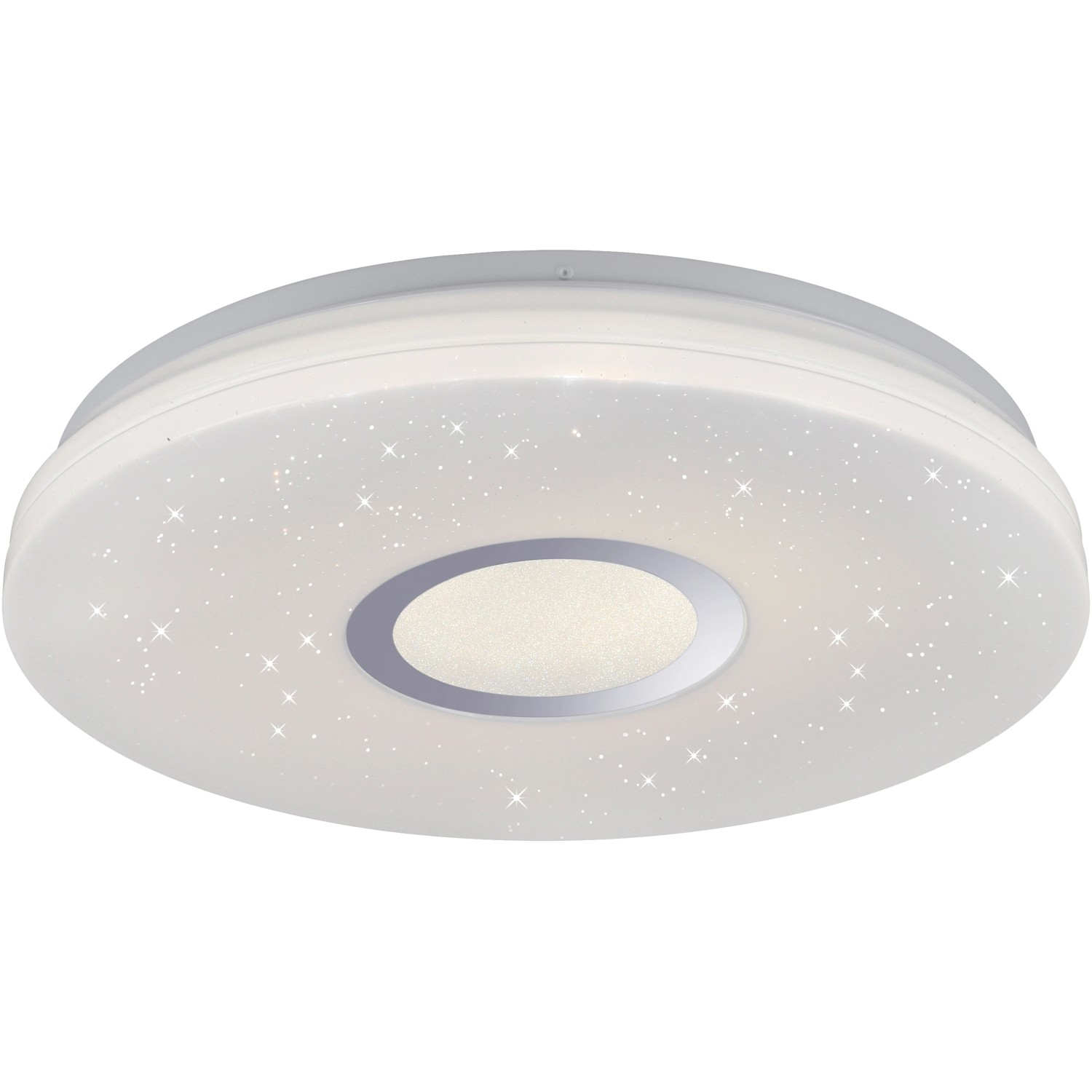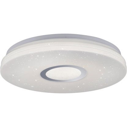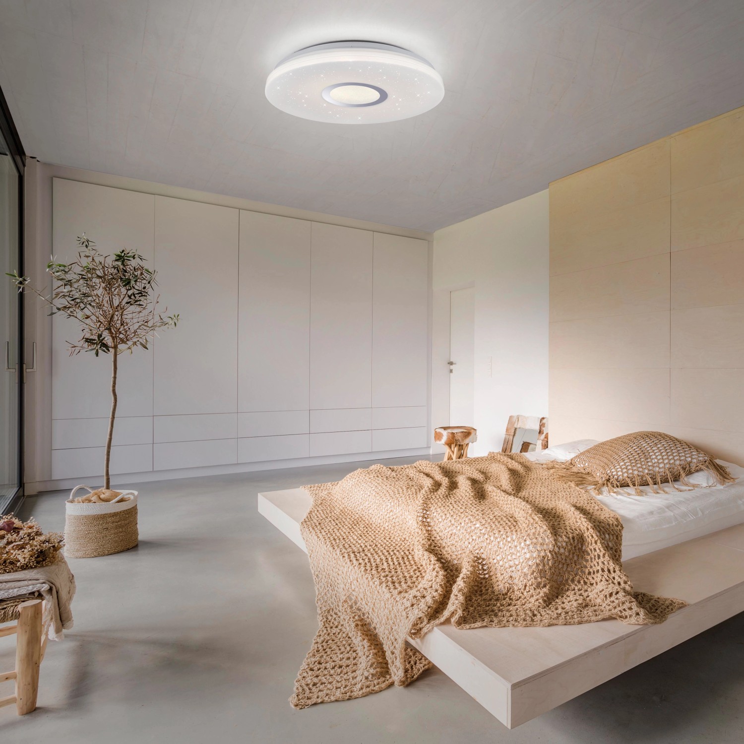 A kerek Jonas mennyezeti lámpa elvarázsol lenyűgöző csillagos égbolt megjelenésével. Képzelje el, hogy egy enyhe nyári estén ül a kertben, az erkélyen vagy egy réten a természetben, és a csillagokat nézi. Milyen megnyugtató, pihentető érzés árad szét az emberben. A nyugalom, a varázslatos látvány. A Jonas mennyezeti lámpával most könnyedén varázsolhat csillagos égboltot otthonába. Acél és műanyag kombinációjából készült, és az üvegbúrában lévő sok kis áttetsző pontnak köszönhetően úgy tűnik, mintha kis csillagok ragyognának. Egy fixen beépített 17,2 W-os LED-izzót tartalmaz. A lámpa mintegy 2420 lumennel világít, és a lámpa fényszínét a melegfehértől (3000 Kelvin) a nappali fehérig (5000 Kelvin), valamint a fényerősséget változtathatja. Ez a szabályozás a lámpa távirányítóval végezhető, amely a csomag részét képezi. A 41,6 cm átmérőjű lámpa sokoldalúan használható és garantáltan különleges helyet talál az egyik lakóhelyiségben. Engedje, hogy elvarázsolja a gyönyörű csillagos égbolt.
