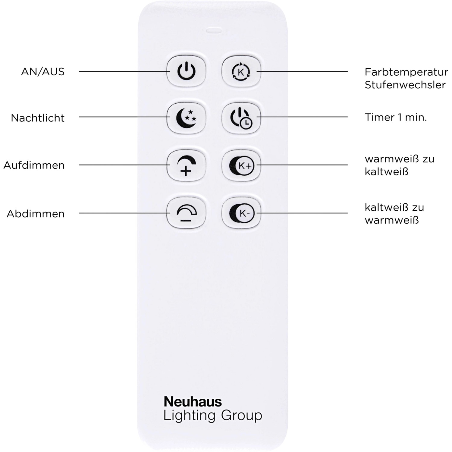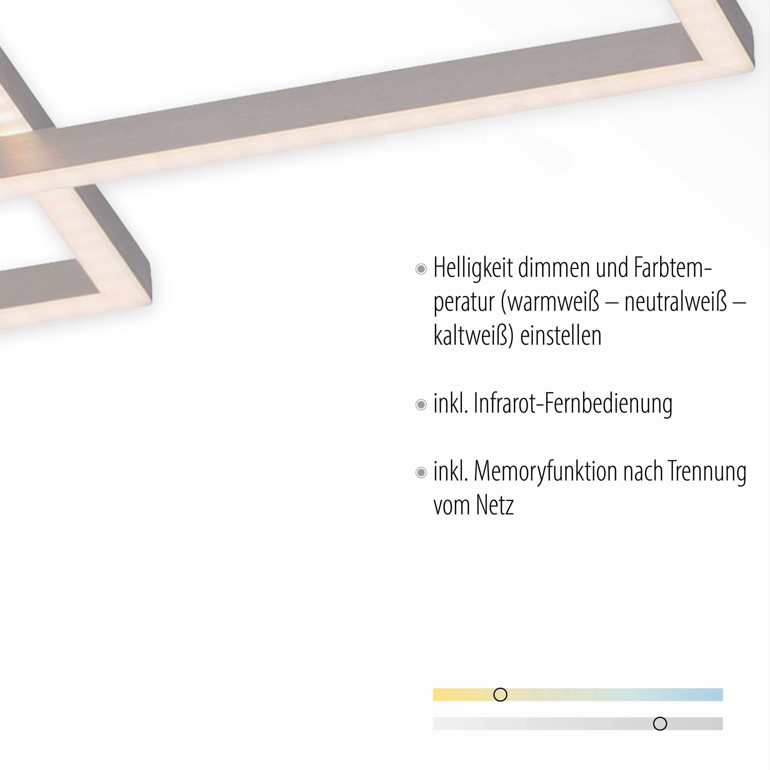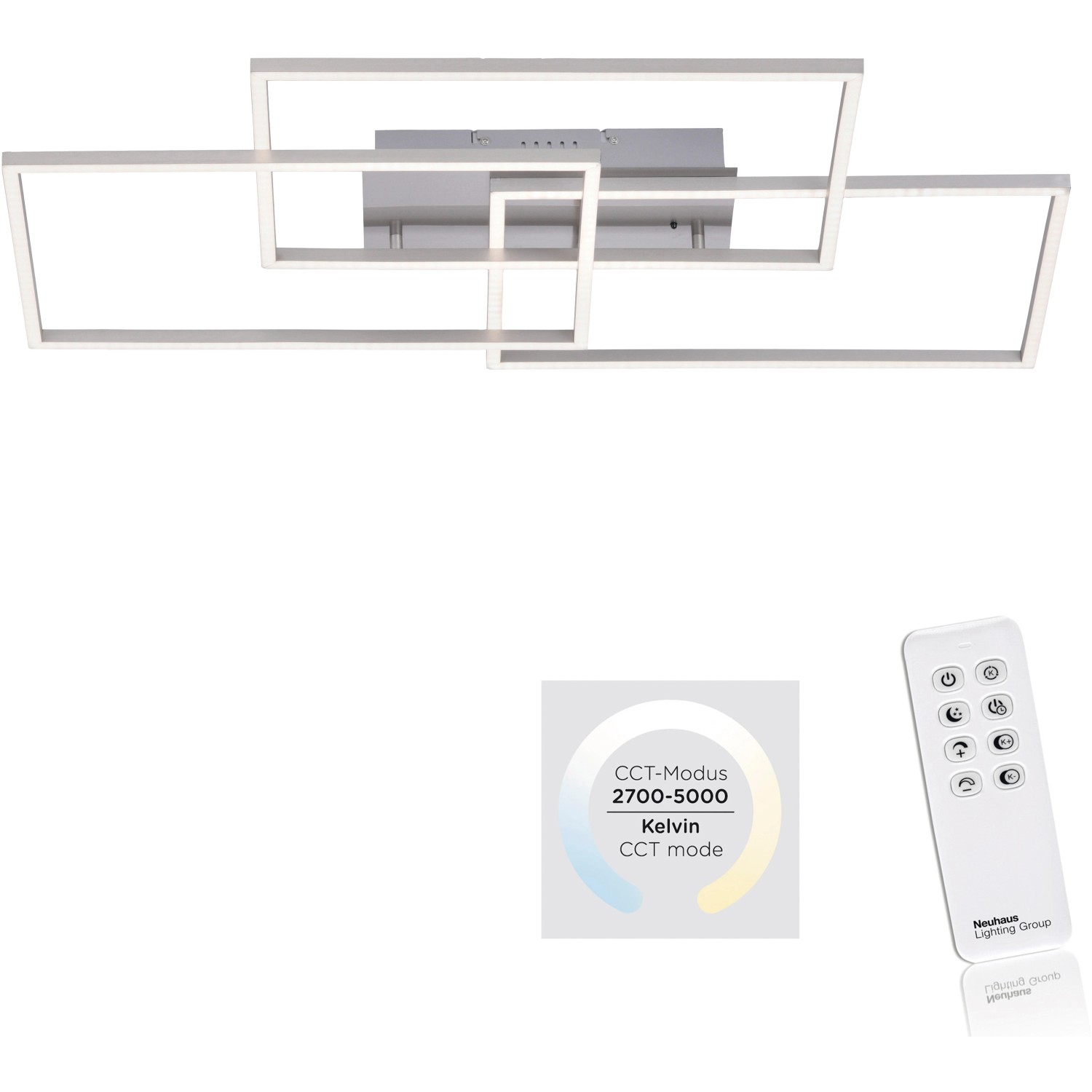 A beépített CCT fénykezeléssel felszerelt mennyezeti lámpa színhőmérséklete a melegfehértől (2700 Kelvin) a nappali fehérig (5000 Kelvin) állítható. A fényszínek szabályozása a mellékelt infravörös távirányítóval végezhető. A fényerősség is tetszés szerint fokozatmentesen állítható az infravörös távirányítóval.