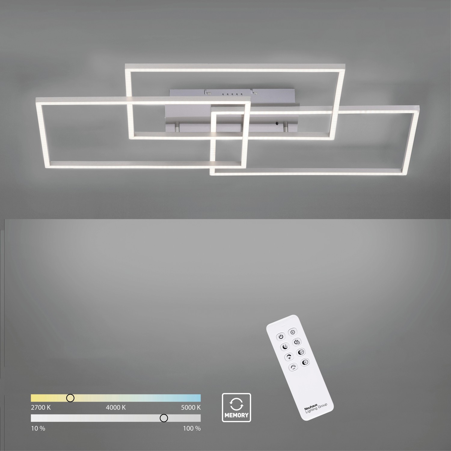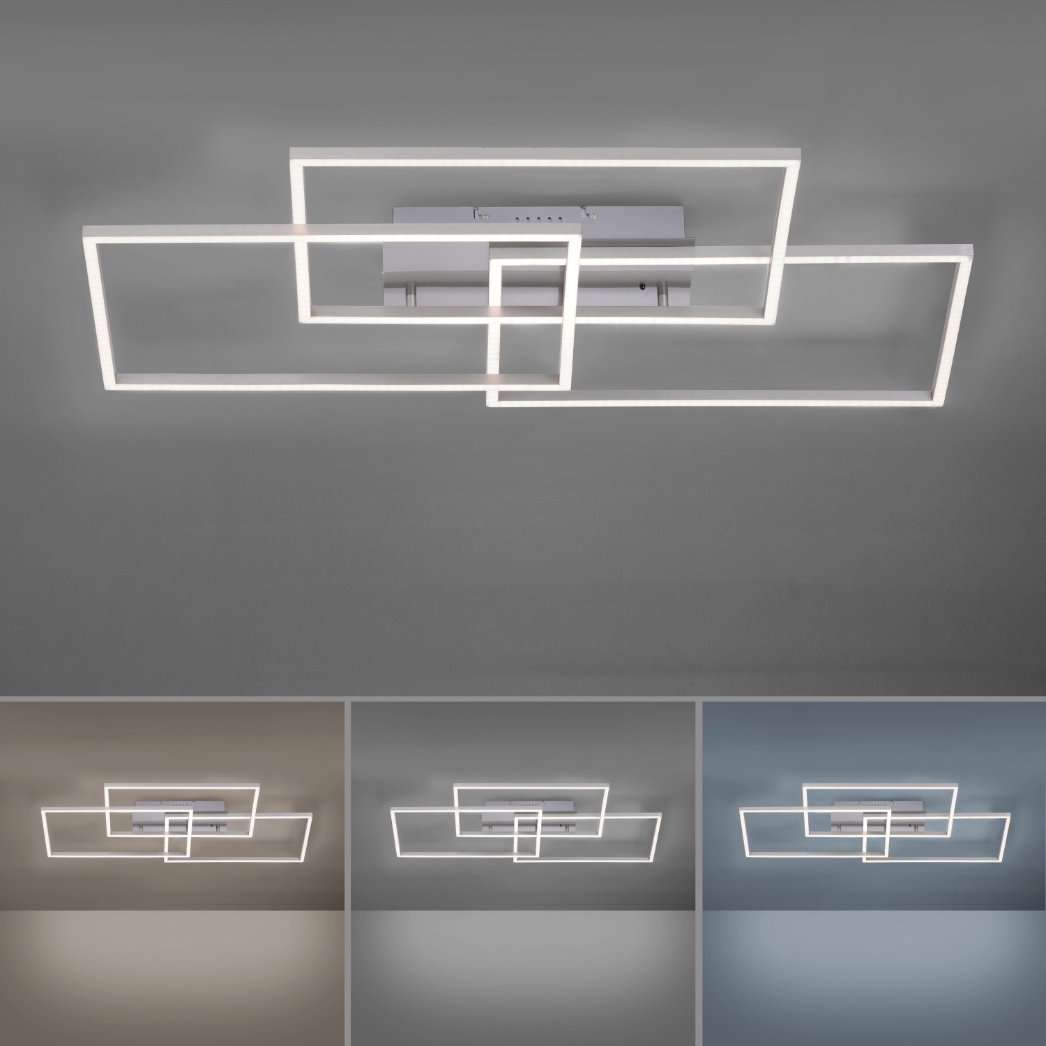 A lámpa megjegyzi az utoljára kiválasztott beállítást a következő módosításig. Egyszerű beállításokkal és a lámpa módosításával állítsa be a fényt a napi rutinjához és a nappali fényhez, hogy növelje a produktivitást és a koncentrációt. A három egymást átfedő téglalap szinte lebeg a mennyezet alatt. A LED-es mennyezeti lámpa különböző helyiségekbe ideális, például hálószobába, nappaliba, előszobába, dolgozószobába, étkezőbe vagy konyhába.