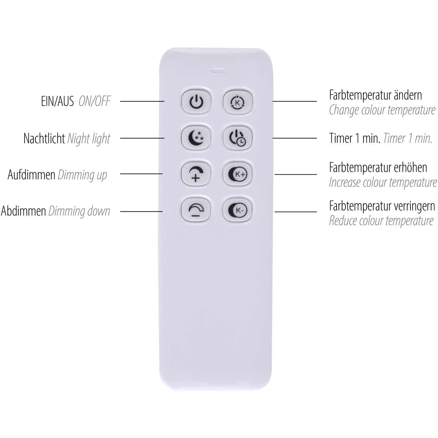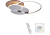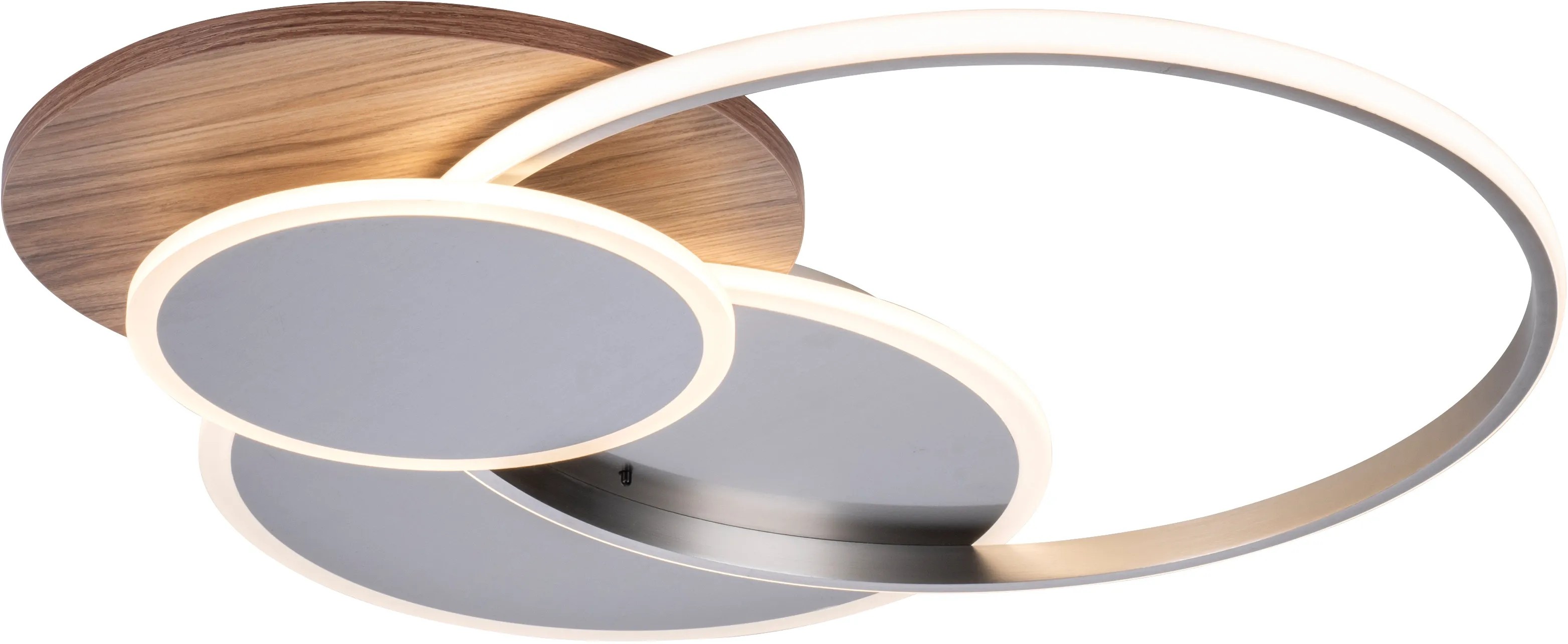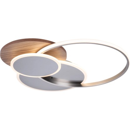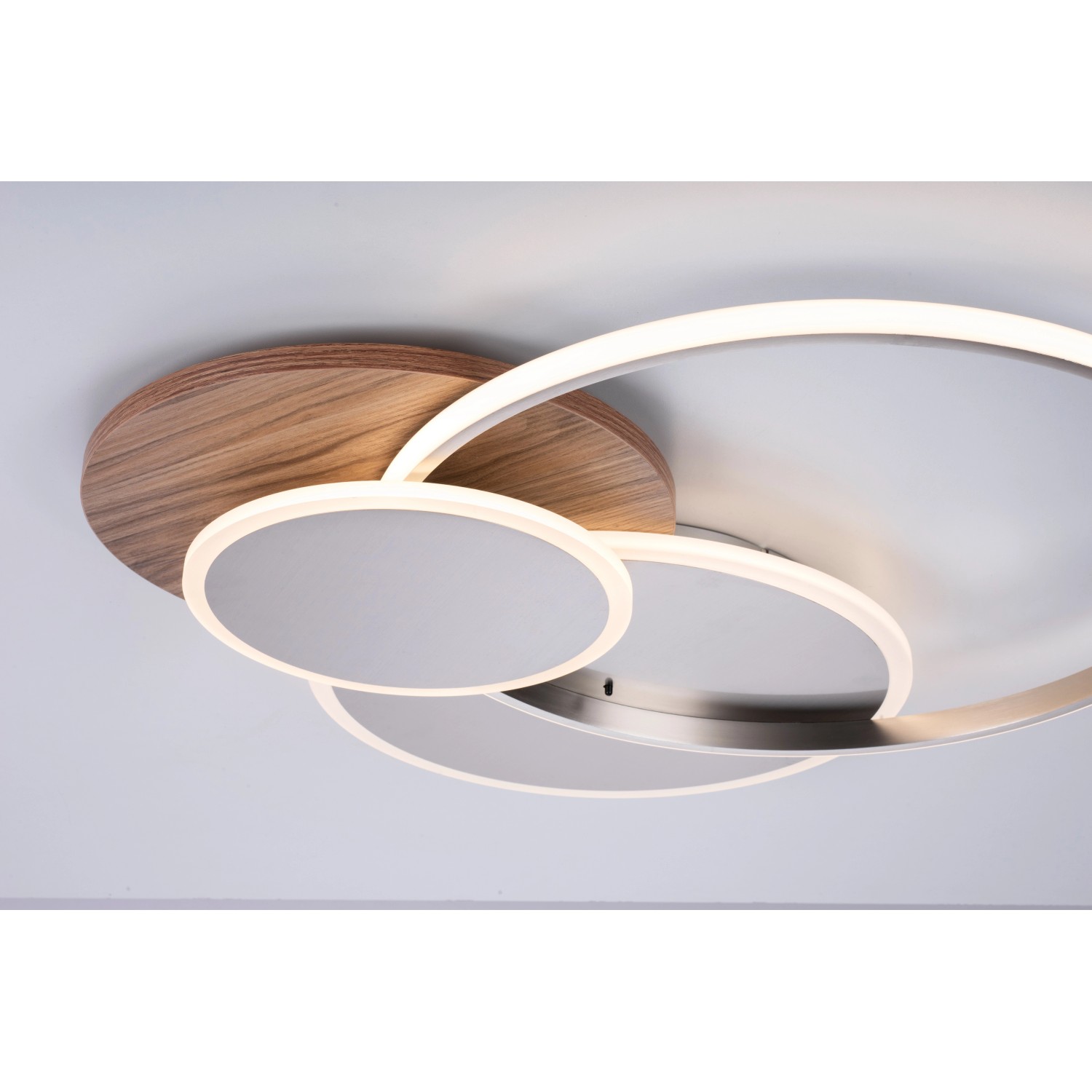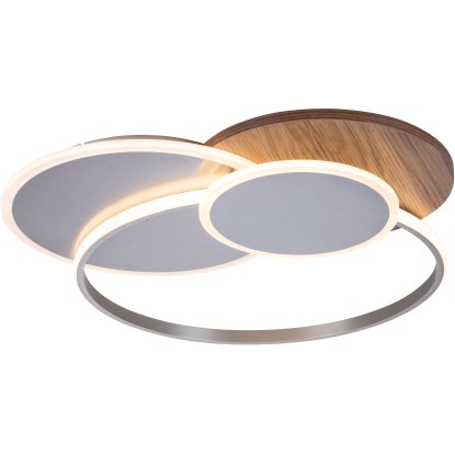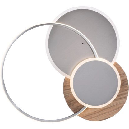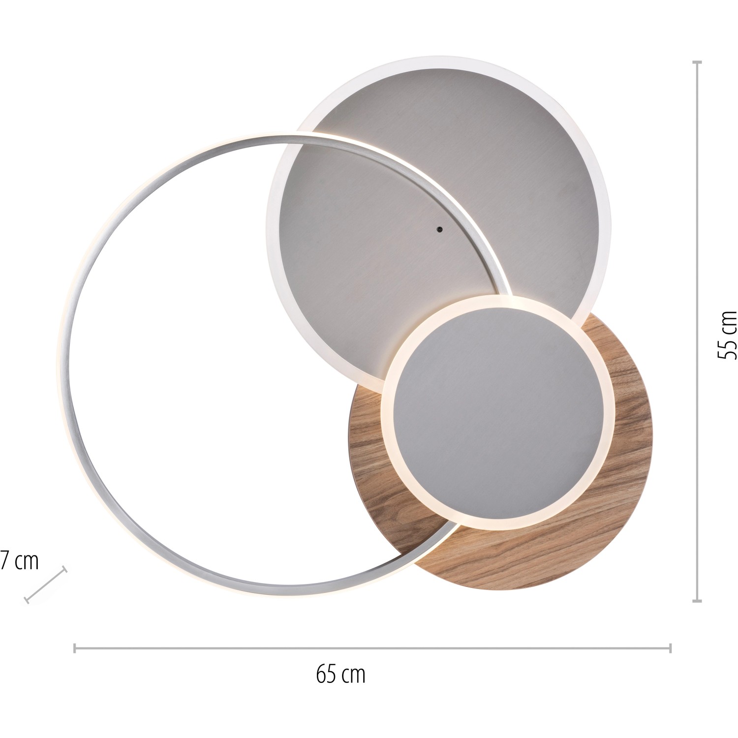 A Palma LED-es mennyezeti lámpa három különböző méretű, ezüstszínű gyűrűből áll, amelyek egymáson helyezkednek el egy fa dekorlapon. A bekapcsolt fény nemcsak a helyiség megfelelő megvilágítását eredményezi, hanem a fény és árnyék hatásos játékát is. A lámpa CCT színkezeléssel felszerelt - így a fény színhőmérsékletét egyénileg szabályozhatja a melegfehértől (2700 Kelvin) a nappali fehérig (5000 Kelvin), így szimulálhatja a nap folyamán előforduló fényszíneket és szabályozhatja a fény intenzitását. A memória funkció révén elmenti a kívánt beállításokat. Ezeket a beállításokat a mellékelt infravörös távirányítóval végezheti el. A mennyezeti világítás modern, kerek kialakítása különösen jól illeszkedik a lakótérbe, és hangulatos légkört teremt. A mennyezeti lámpa átmérője 65 cm, felfüggesztése pedig 7 cm.