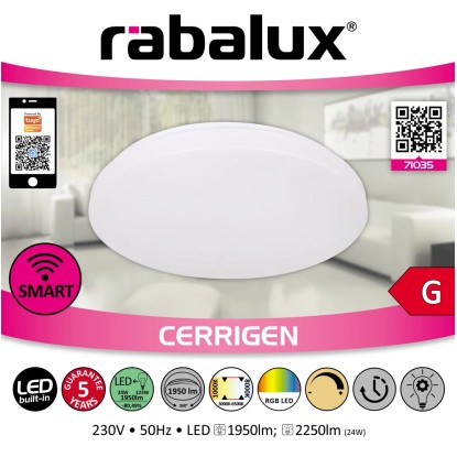 A kerek Cerrigen mennyezeti lámpa minden igényt kielégítő okos lámpa, amely bármely modern nappaliban vagy hálószobában megállja a helyét. A fémből készült fehér színű modellt fehér műanyagbúra egészíti ki, és a G energiaosztályba tartozó beépített LED fényforrással rendelkezik, amelynek a teljesítménye 24 W, fényereje búrával 1950 lumen, búra nélkül 2250 lumen, élettartama pedig 25 000 óra. A lámpa színhőmérséklete 3000-6500 K között állítható, azaz képes meleg, természetes vagy hideg fehér fénnyel világítani. További extrák az állítható fényerő, az RGB világítás, a memória és az időzítő funkció. És ez még nem minden: a Cerrigen wifin vagy Bluetooth-on keresztül vezérelhető! A színhőmérséklet, a fényerő és az időzítő telefonos alkalmazás segítségével szabályozható, míg a memória funkció kapcsolóval állítható. A mennyezeti lámpa átmérője 310 mm, mennyezettől mért távolsága pedig mindössze 55 mm.