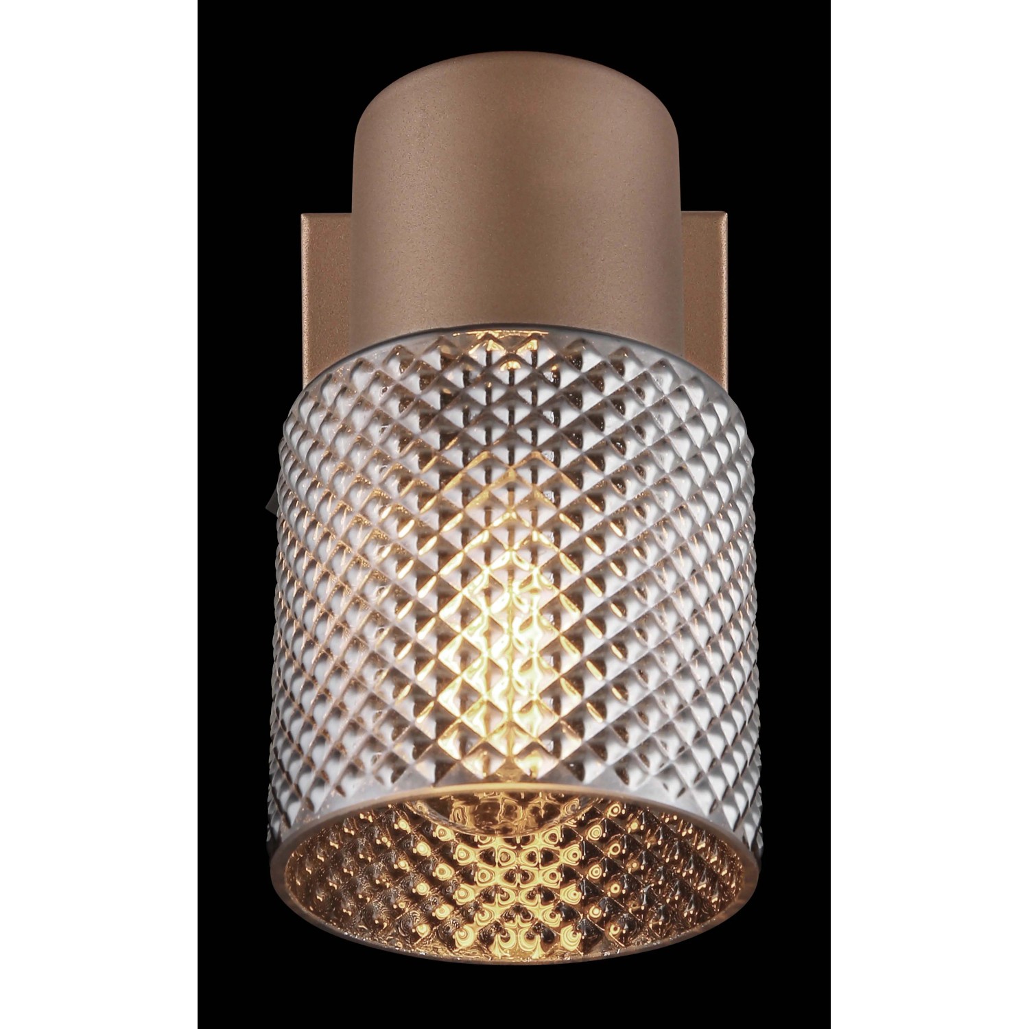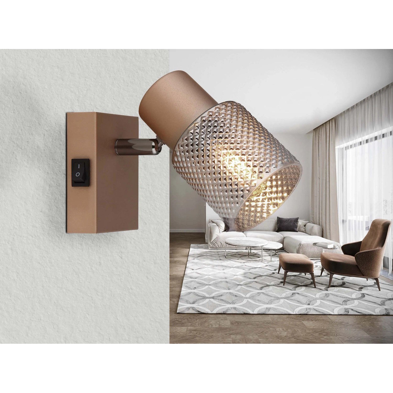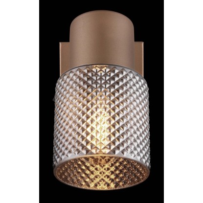 Fali spotlámpa, fém kávészínű matt, fém fekete-króm, üveg füstszínű kristály hatású, billenőkapcsolóval felszerelve.