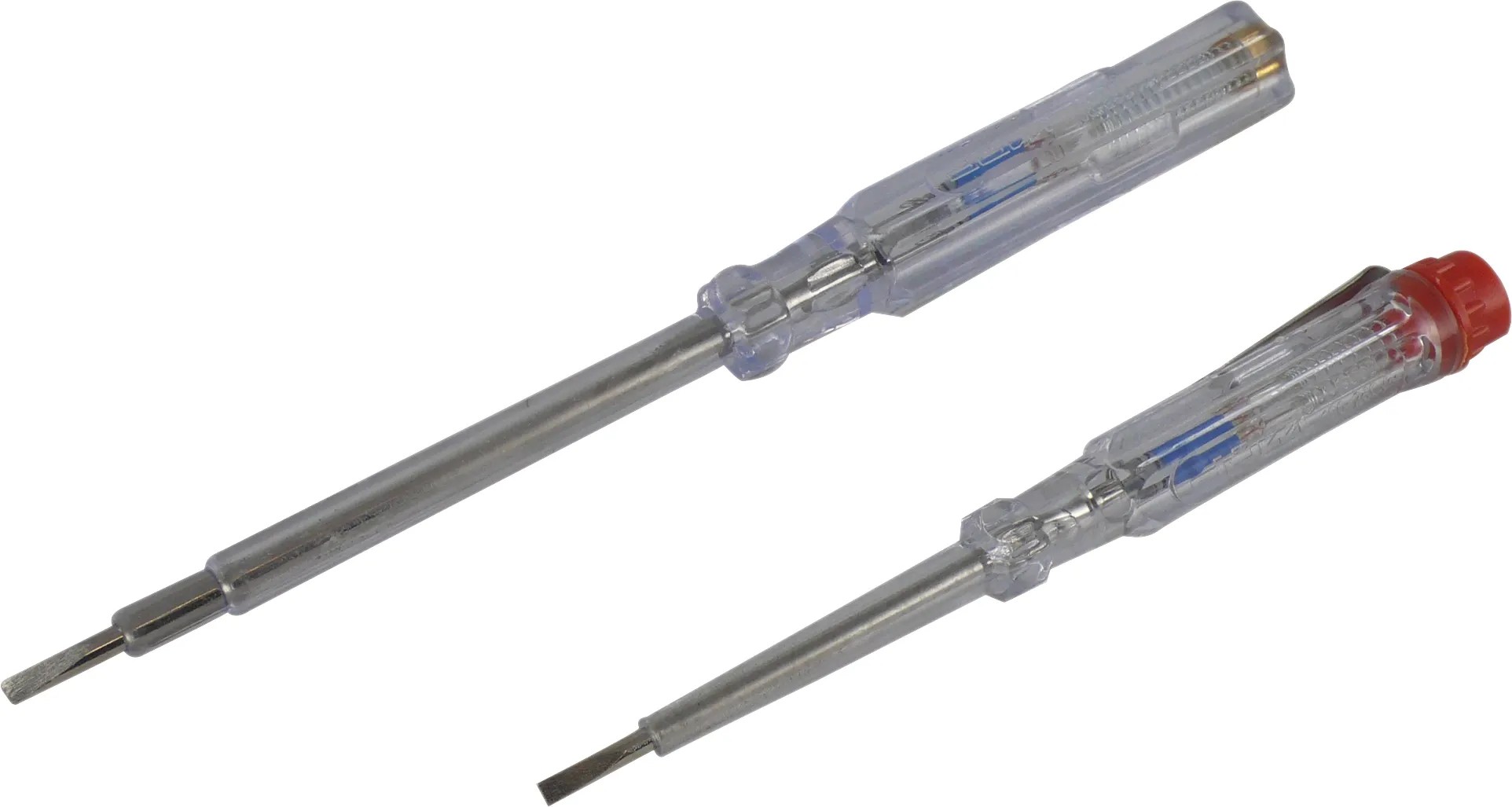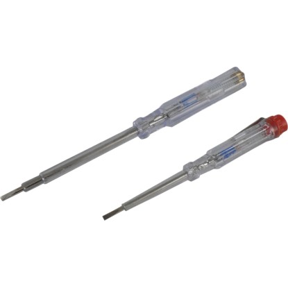A REV Ritter feszültségvizsgáló készlet két klasszikus, 14 cm és 19 cm méretű fázisceruzát tartalmaz. A fázisceruzák 100-250 V AC, 50 Hz feszültség megállapítására alkalmasak.