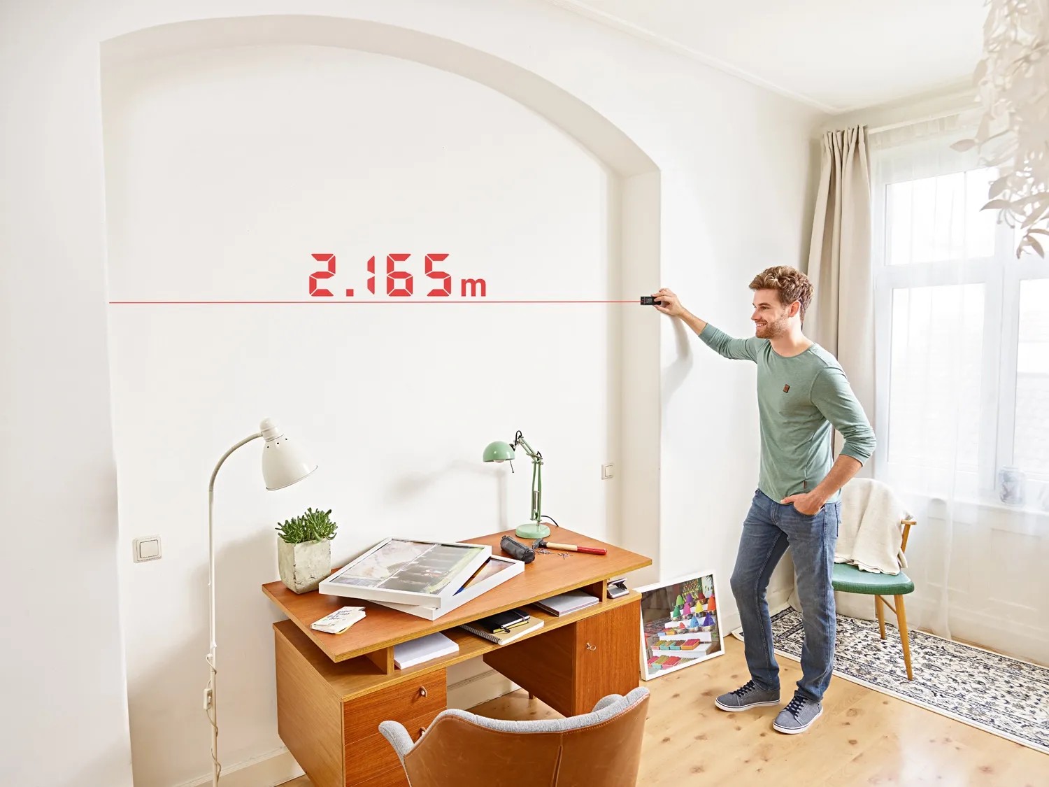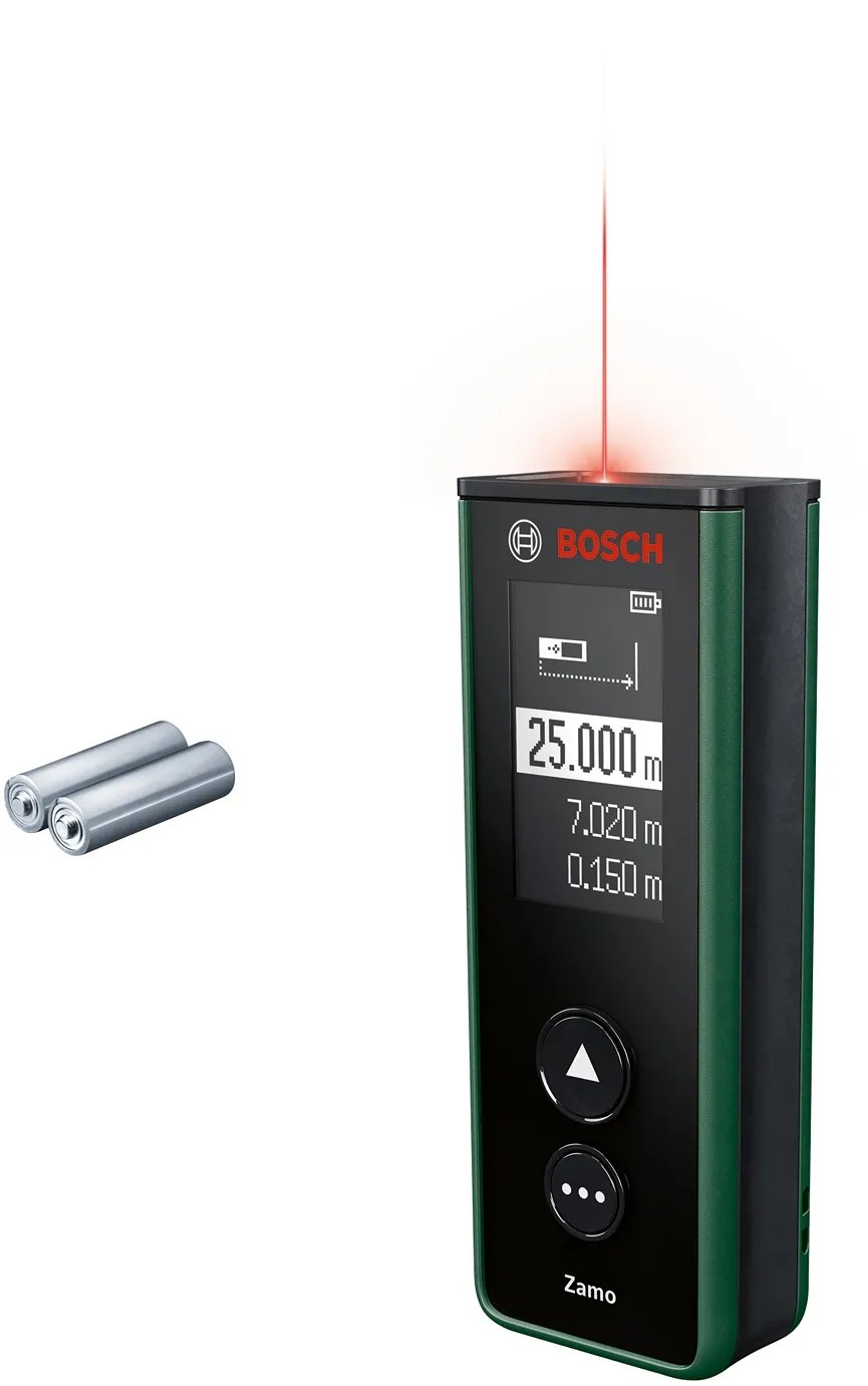 A Bosch Zamo lézeres távolságmérővel könnyedén meghatározhatók helyiségek hosszúsági vagy magasság méretei, akár bútorok elrendezéséről, akár felújításkor a festéshez, ill. padlóburkoláshoz szükséges anyagmennyiségek meghatározásáról van szó. Pozicionálás, célzás és a Zamo egyetlen gombnyomással precíz távolságokat mér akár 25 méterig. Területszámítást is végez, ezért nagyon praktikus a tapéta, padlóburkolat vagy egyéb anyagok szükséges mennyiségének meghatározásához.