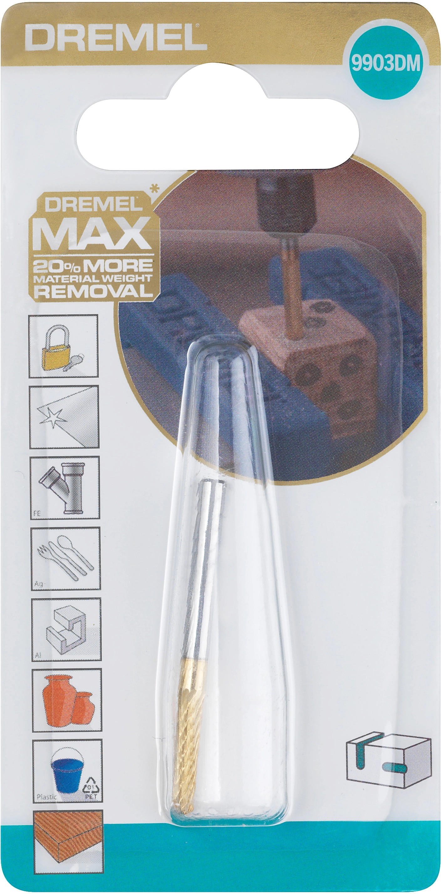 A Dremel 9903DM volfrám-karbid marószár titán-nitriddel van bevonva. Ennek köszönhetően 2-szer hosszabb ideig tart, mint a szokásos bevonat nélküli tartozékok, és 20%-kal több anyagot távolít el, mint a hagyományos 9903.