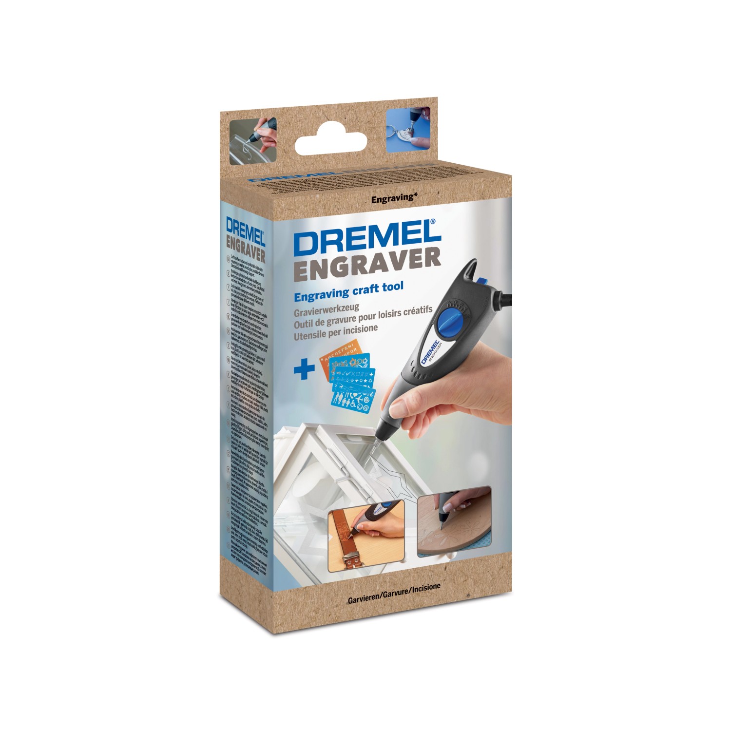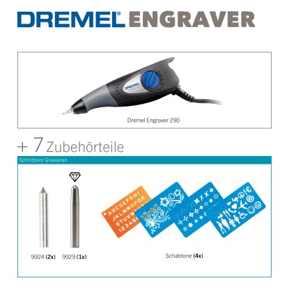 Tartalom: 1 Dremel gravírozó, 2 cserélhető karbid hegy, 1 cserélhető gyémánt hegy, 1 betű- és egy számsablon, 3 motívumsablon, kezelési útmutató