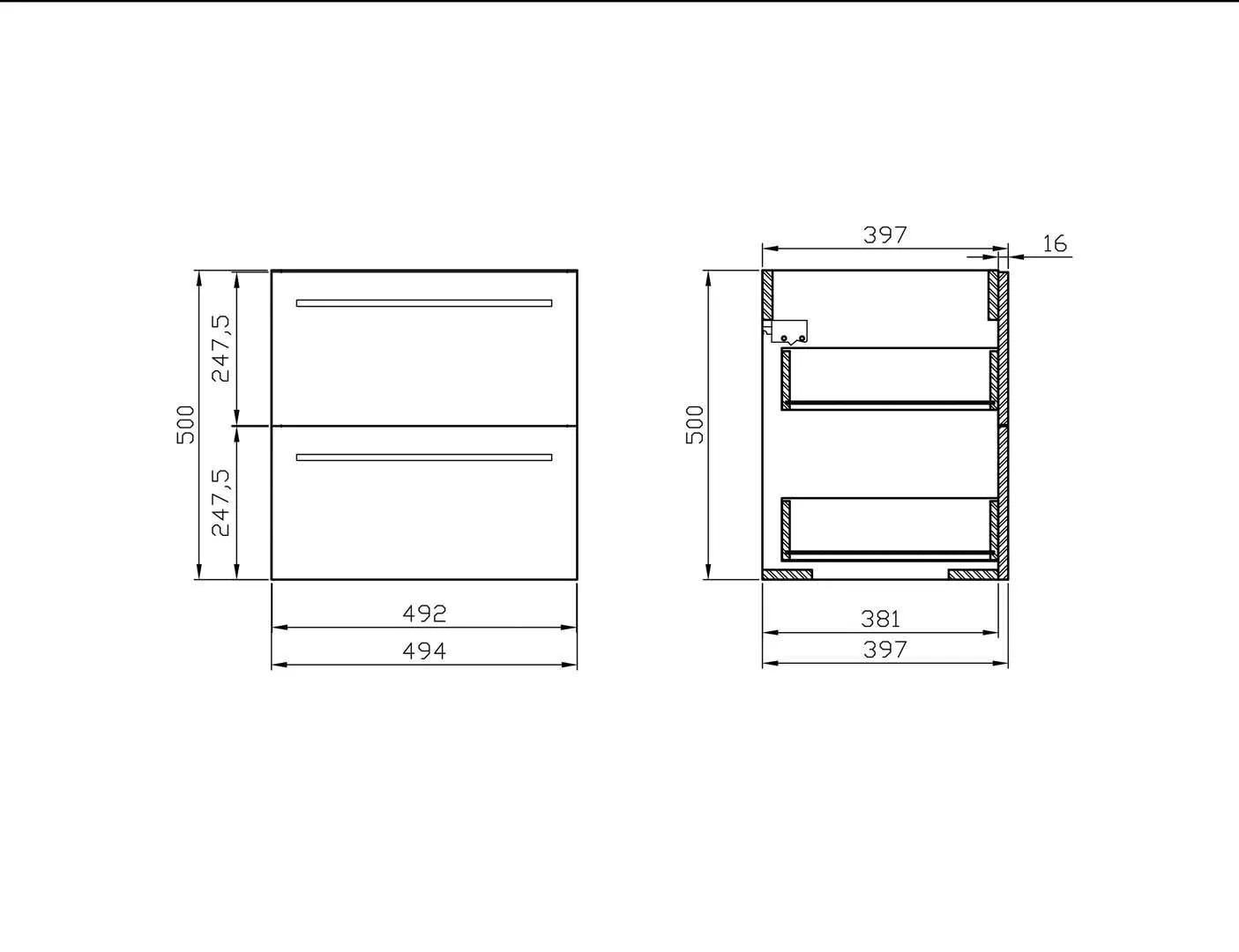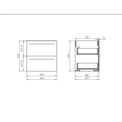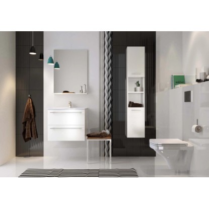 Cersanit Elisa 50 bútor szett. A bútor lapraszerelt. Függesztett kivitelű, kettő fiókkal ellátott bútor. Magasfényű fehér fóliázott 16 mm-es forgácslapból készült. A fiókok csillapított záródású fióksínekkel és nagyméretű krómozott fogantyúkkal vannak ellátva. A szett tartalmazza az 50 cm széles, vékony kivitelű Ontario mosdót. Méret: 51 cm x 50 cm x 40 cm.