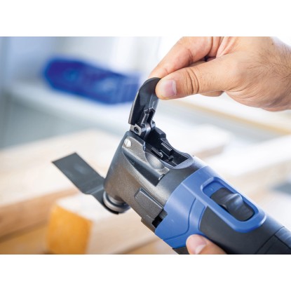 A multifunkciós szerszám cserélhető fejei robusztus szerszámacélból készültek. Stabil műanyag háza ergonomikus kialakítású puha markolattal rendelkezik, amely fáradtságmentes munkavégzést tesz lehetővé. A könnyen elérhető kapcsolókkal kényelmesen be- és kikapcsolhatja a készüléket, és a választókerékkel fokozatmentesen állíthatja be a kívánt sebességet.