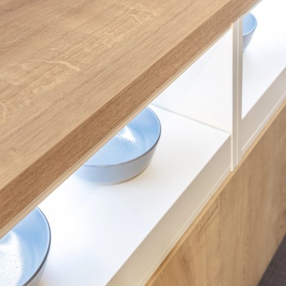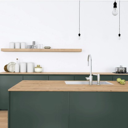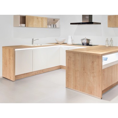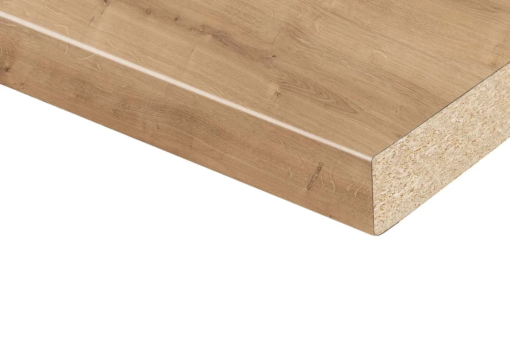 A modern fa díszítésű munkalap exkluzív megjelenést kölcsönöz konyhájának. Strukturált felületével a tölgy megjelenését utánozza. A munkalap mérete 410 cm x 60 cm x 3,8 cm (Ho x Sz x Ma). A keményfa könnyen megmunkálható és a trópusi fa valódi alternatívája. A lekerekített elülső él minimálisra csökkenti az ütközés kockázatát. Ez az éltípus különösen alkalmas gyermekes háztartások számára.