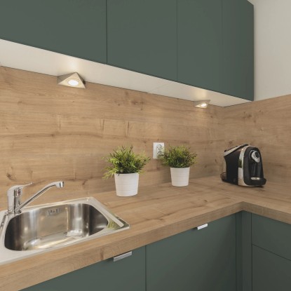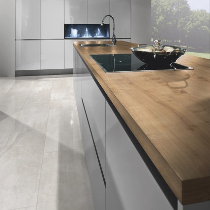 A robusztus munkalap ellenáll a konyhai igénybevételnek. 90 %-ban fát tartalmazó, strapabíró műanyag laminátból készült. A felület különösen ütés- és karcálló, valamint hő- és vízgőzálló. A magas kopás- és fényállóságnak köszönhetően a laminált munkalap exkluzív megjelenése rendkívül hosszú ideig megmarad.