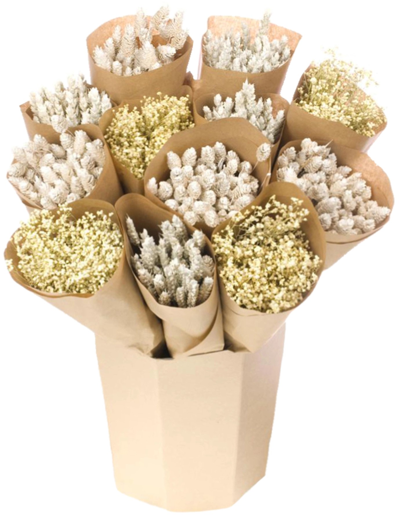 Ha az egyénileg készített koszorúknak és virágdíszeknek vidám világos megjelenést szeretne kölcsönözni, a pasztell szárított virágcsokor a legjobb választás. A csokorban szárított, valamint pasztell sárga és fehér festett természetes anyagok érdekes választékát találja. Ezekkel a hangulatos színfoltokkal könnyedén létrehozhat egy gyönyörű dizájnt, amelyet sokáig élvezhet. Ideális virágos megjelenés kialakítására minden évszakban és minden alkalomra Egyszerűen engedje szabadjára a kreativitását.