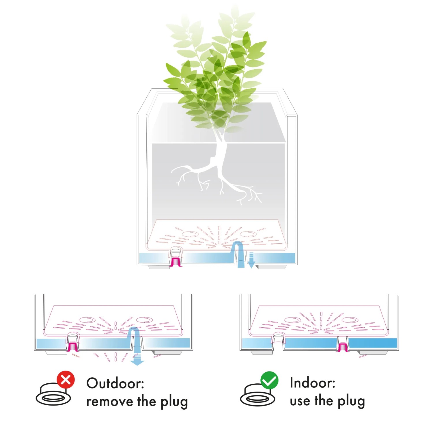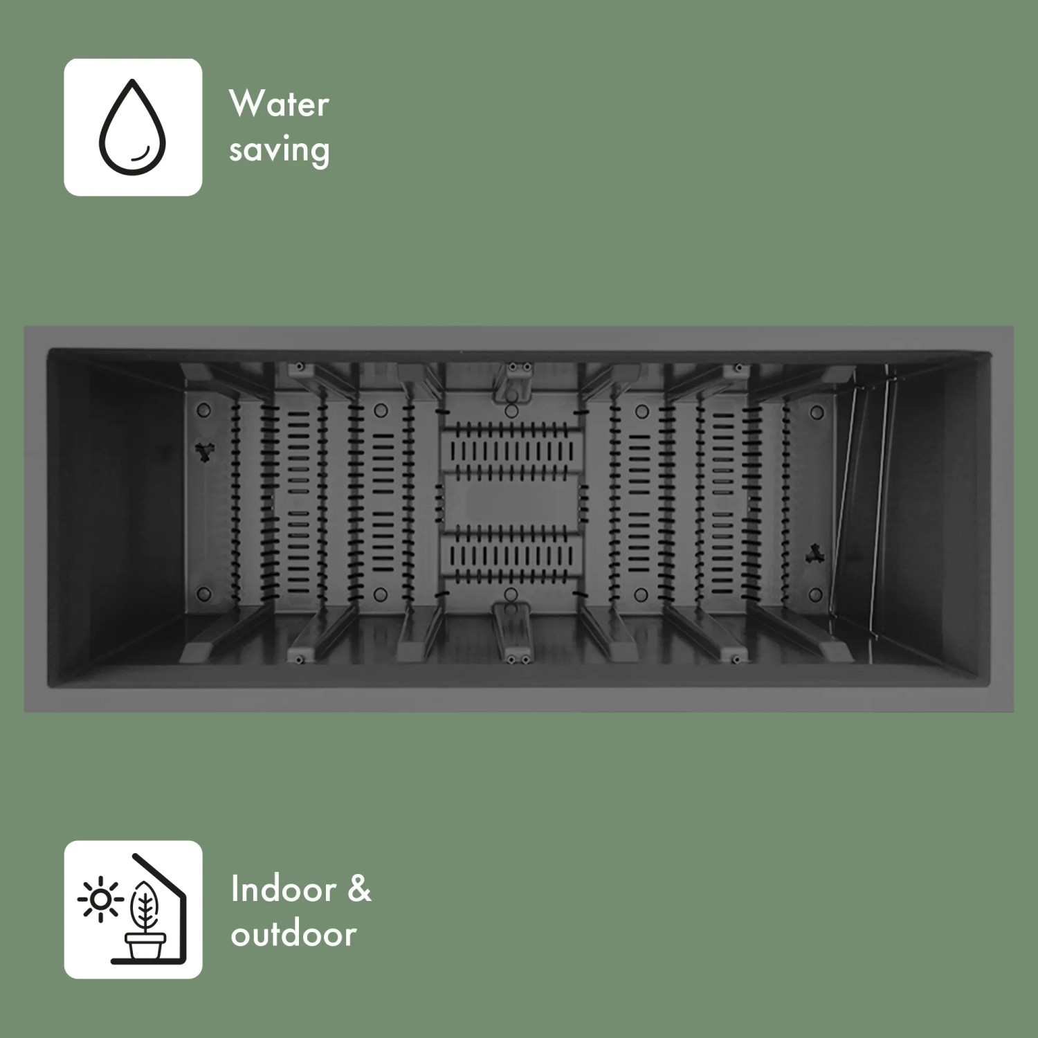 A kaspó UV-álló és újrahasznosítható. A virágláda ezenkívül dupla fallal és erős peremekkel rendelkezik a hosszú élettartam érdekében. Ezenkívül a cserép alján egy dugó található, így az edény bel- és kültéren egyaránt használható.