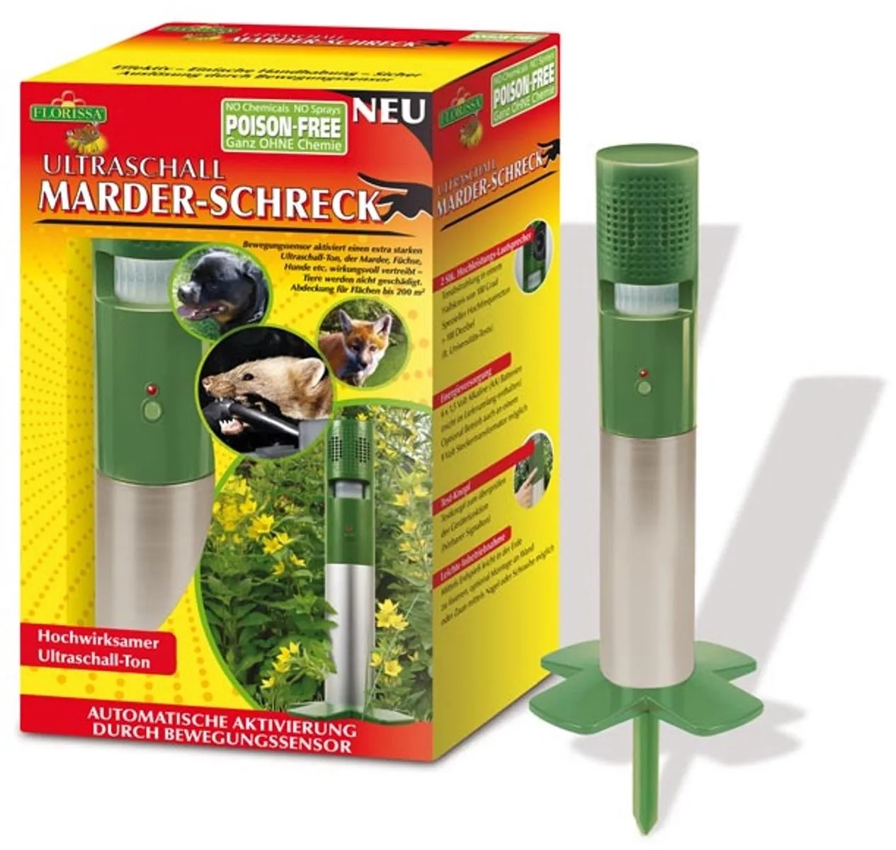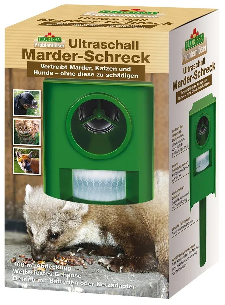 Hatékony módszer a nyestek, rókák és nagyobb kutyák elriasztására. Extra erős ultrahangot (kb. 100 decibel) bocsát ki, mely az ember számára nem érzékelhető. A hang terjedése félkör alakban, 180 C°-os szögben történik, hatótávolsága elérheti akár a 100 m2-t. A beépített mozgásérzékelő segítségével automatikusan működésbe lép. A készülék nem öli meg az állatot, csak elriasztja. A csomaghoz tartozó dübellel / csavarral könnyedén rögzíthető a talajban, a falon vagy a kerítésen. A működéséhez szükséges 2 db 9V-os elemet a csomagolás nem tartalmazza.