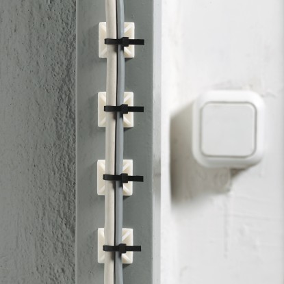 A fehér OBI öntapadós kábeltartó kábelek és tömlők rögzítésére és összekötésére használható. Erős műanyagból készült, és erőst tartást biztosít a legkülönfélébb felületeken, így rugalmasan használható. A kicsi, praktikus segédeszközzel elrejtheti és tetszés szerint rendezheti a kábelkötegeket. Az öntapadós kábeltartó 2 cm x 2 cm méretű, és legfeljebb 5 mm széles kábelkötegelőkhöz alkalmas. A csomag 20 darabot tartalmaz.