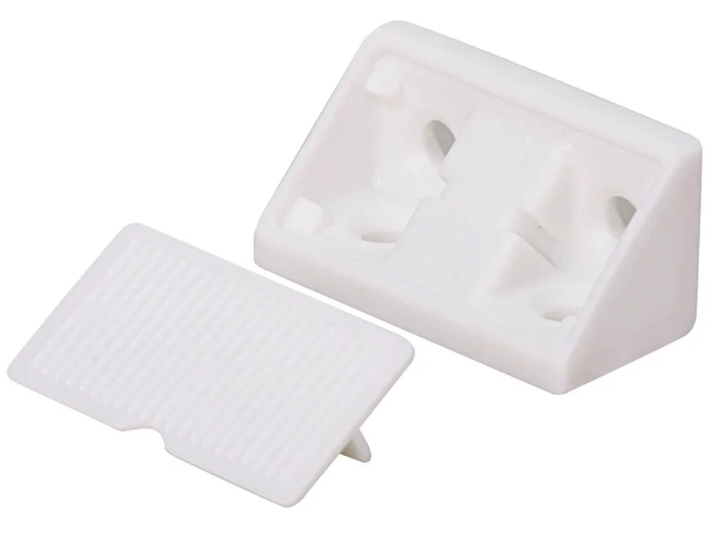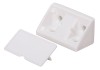Műanyagból készült univerzális sarokösszekötő felcsavarozáshoz, takarókupakkal és rögzítőanyaggal.