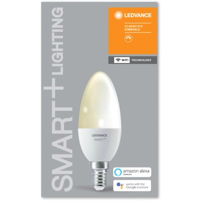 A Ledvance klasszikus gyertya alakú, intelligens Wifi LED-es lámpája egy intelligens, vezeték nélküli vezérlési technológiával ellátott izzó. Az innovatív LED-technológiának köszönhetően az izzót hosszú élettartam és magas energiahatékonyság jellemzi. Az opálszínű üvegizzó tökéletes az intelligens általános beltéri világításhoz.