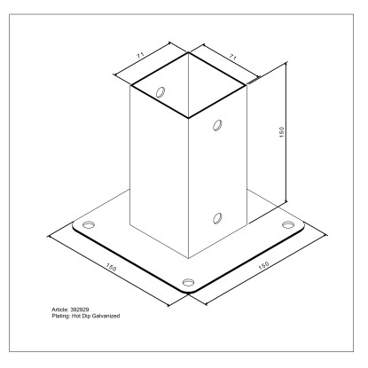 A 8 furatú lecsavarozható oszloptartó számos aljzaton rögzíthető. A tűzihorganyzás révén időjárásálló, ezért kültéri használatra alkalmas. A talajba helyezett lecsavarozható oszloptartó 70 x 70 mm-es oszlopokhoz használható.
