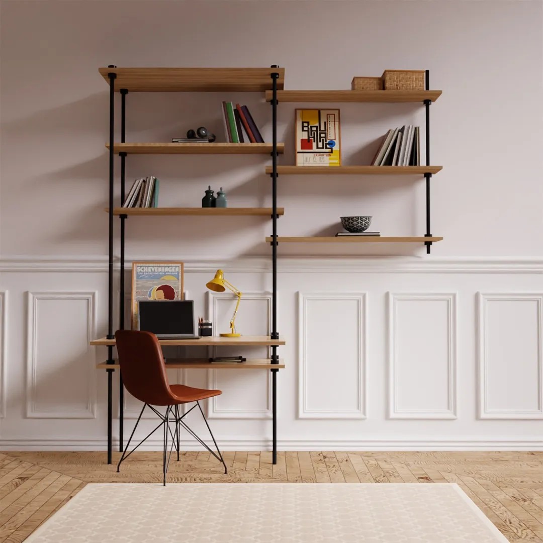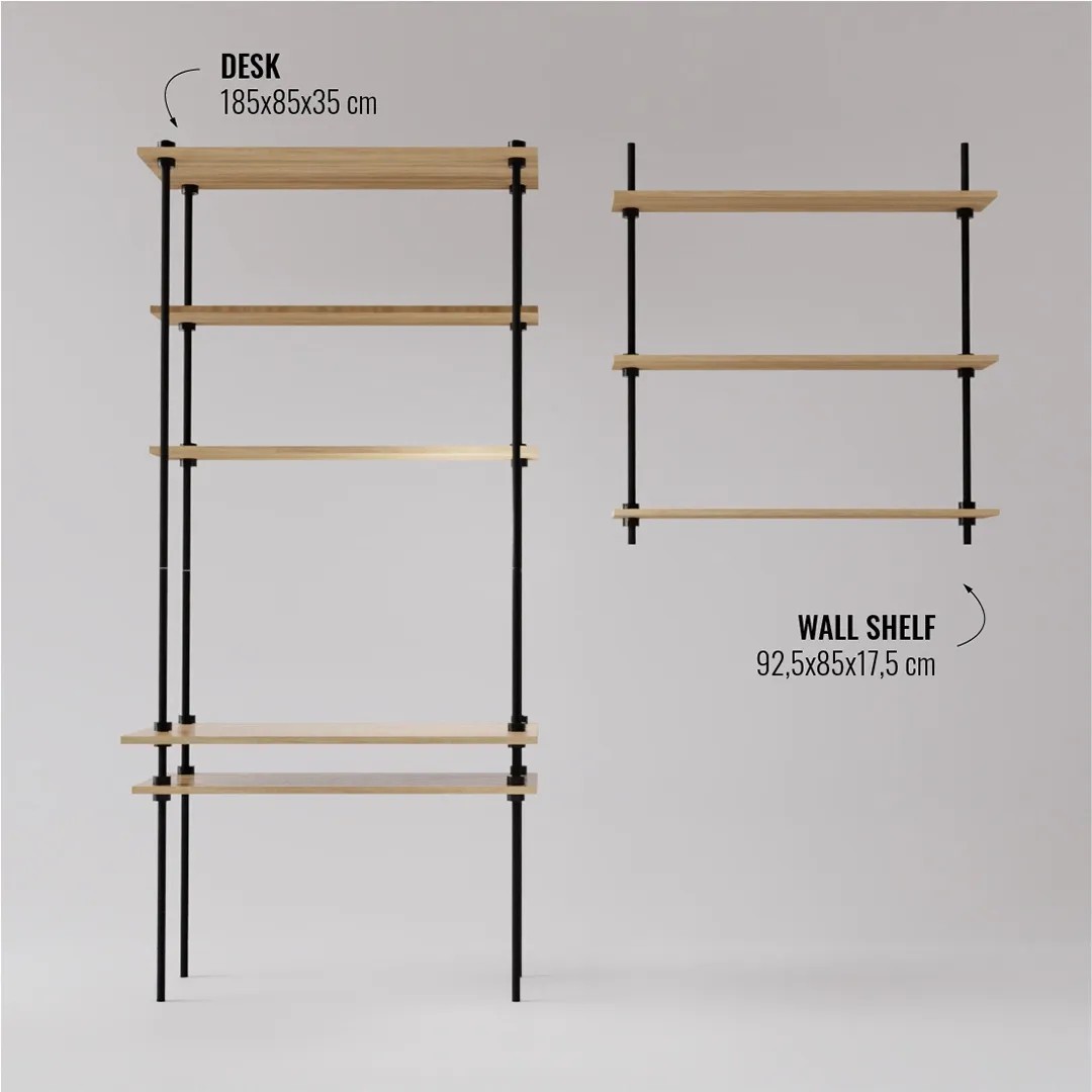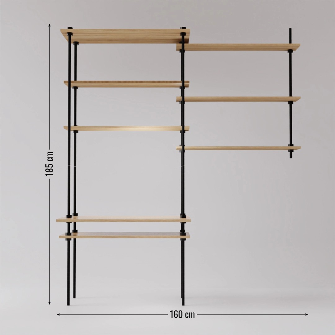 A polcállvány nemcsak tárolásra használható, hanem praktikus íróasztalként is szolgálhat. Modern és időtlen kialakításával, minőségi laminált fapolcaival és stabil fémvázával bármilyen berendezéshez illik.