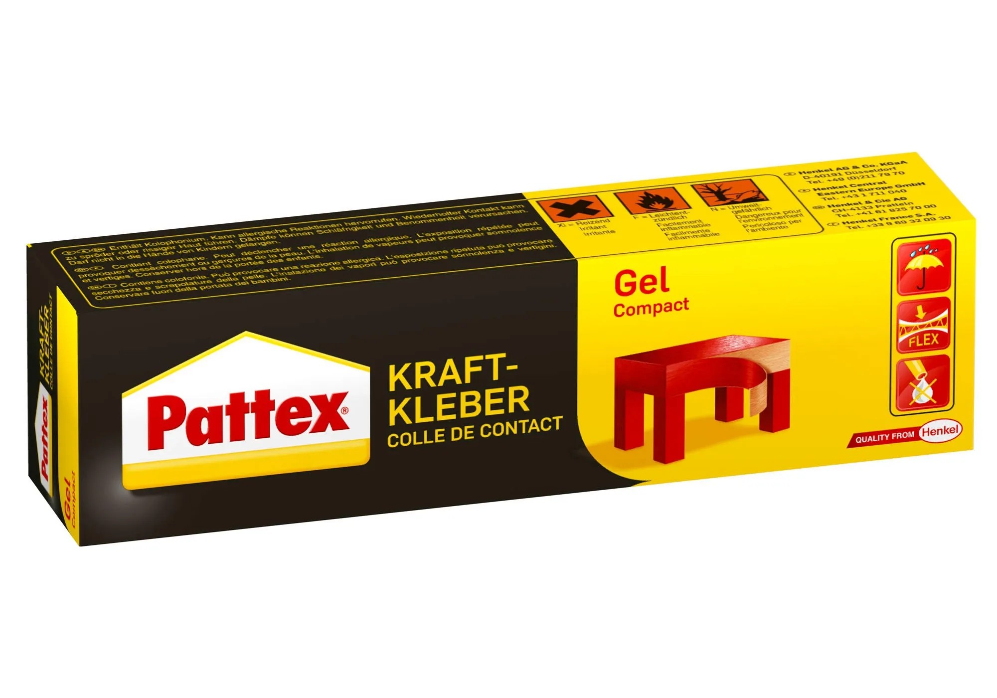 A Pattex Compact egy rugalmas, gél állagú kontaktragasztó (az oldószer elpárolgását biztosítani kell) rendkívül erős rögzítéshez. Nem folyik és nem csöpög, ezért függőleges felületeken is alkalmazható.