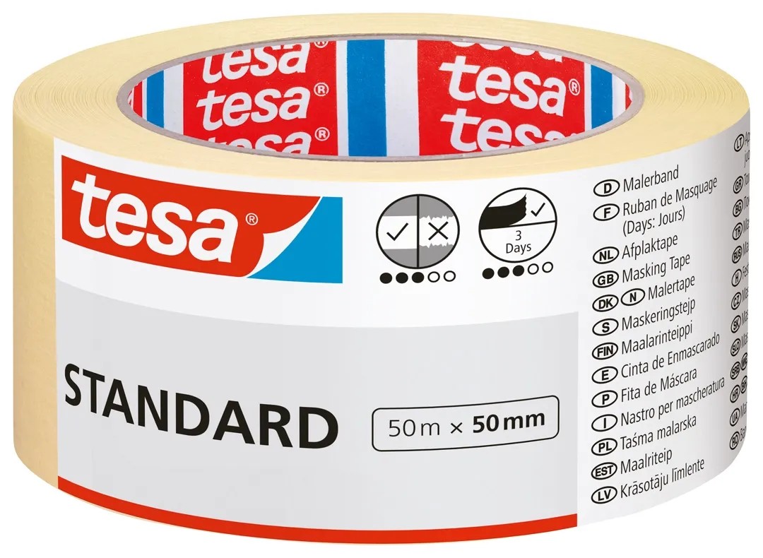 A tesa Standard festőszalag egy univerzális maszkolószalag, ami falfestéskor, felújításkor elsőként kell eszébe jusson bárkinek, aki szeret barkácsolni, saját maga kifesteni otthonát. Használja ezt a sokoldalú maszkolószalagot a felületek, szélek megfelelő védelmére szinte bármilyen helyzetben. Ötféle szélességben elérhető, hogy sokféle különböző feladatra megtalálja a legalkalmasabbat . Ragasztóbevonata oldószermentes. Jól tapad a legtöbb felületre, ugyanakkor könnyen eltávolítható anélkül, hogy nyomot hagyna. Ha három napon belül lehúzza a szalagot, teljesen ragasztó- és papírmaradék-mentes eltávolításra számíthat.