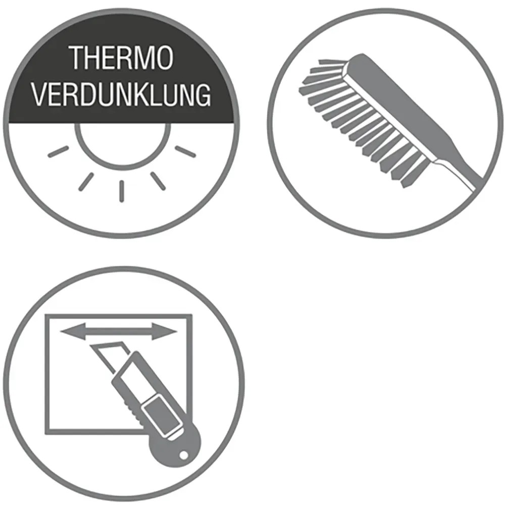 A poliészter anyag nem engedi át a fényt, alumíniummal bevont hátoldala a hideg hónapokban energiatakarékos, a meleg hónapokban pedig kiszorítja a hőt. Az Easyfix Thermo roló lánccal tekerhető fel és le. A lánc jobbra vagy balra is felszerelhető.