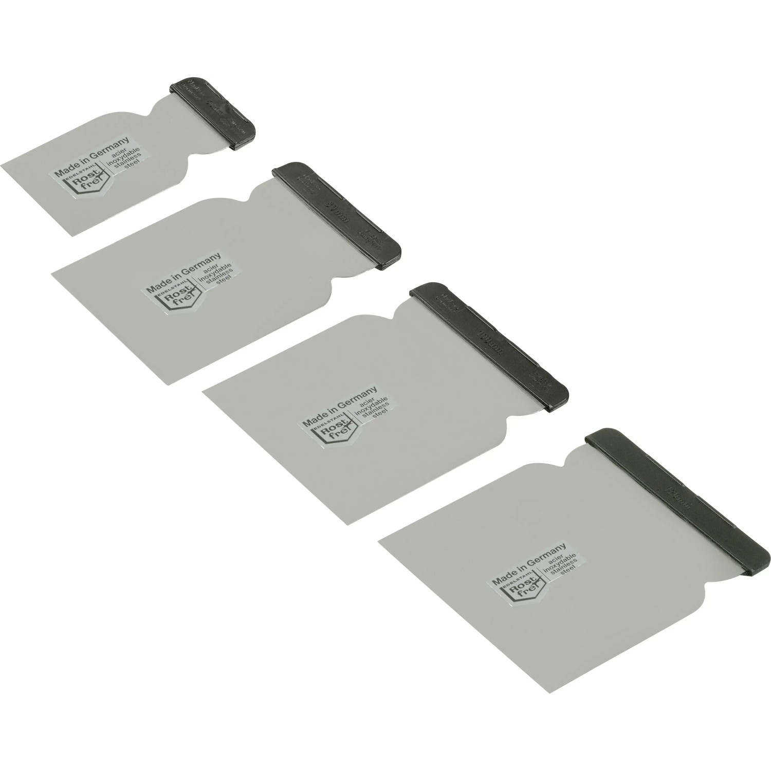 A rozsdamentes acélból készült, Németországban gyártott sokoldalú spatulyák kiváló minőséget, hosszú élettartamot és korrózióállóságot garantálnak. A fekete műanyag fogantyúk lehetővé teszik a biztonságos használatot.