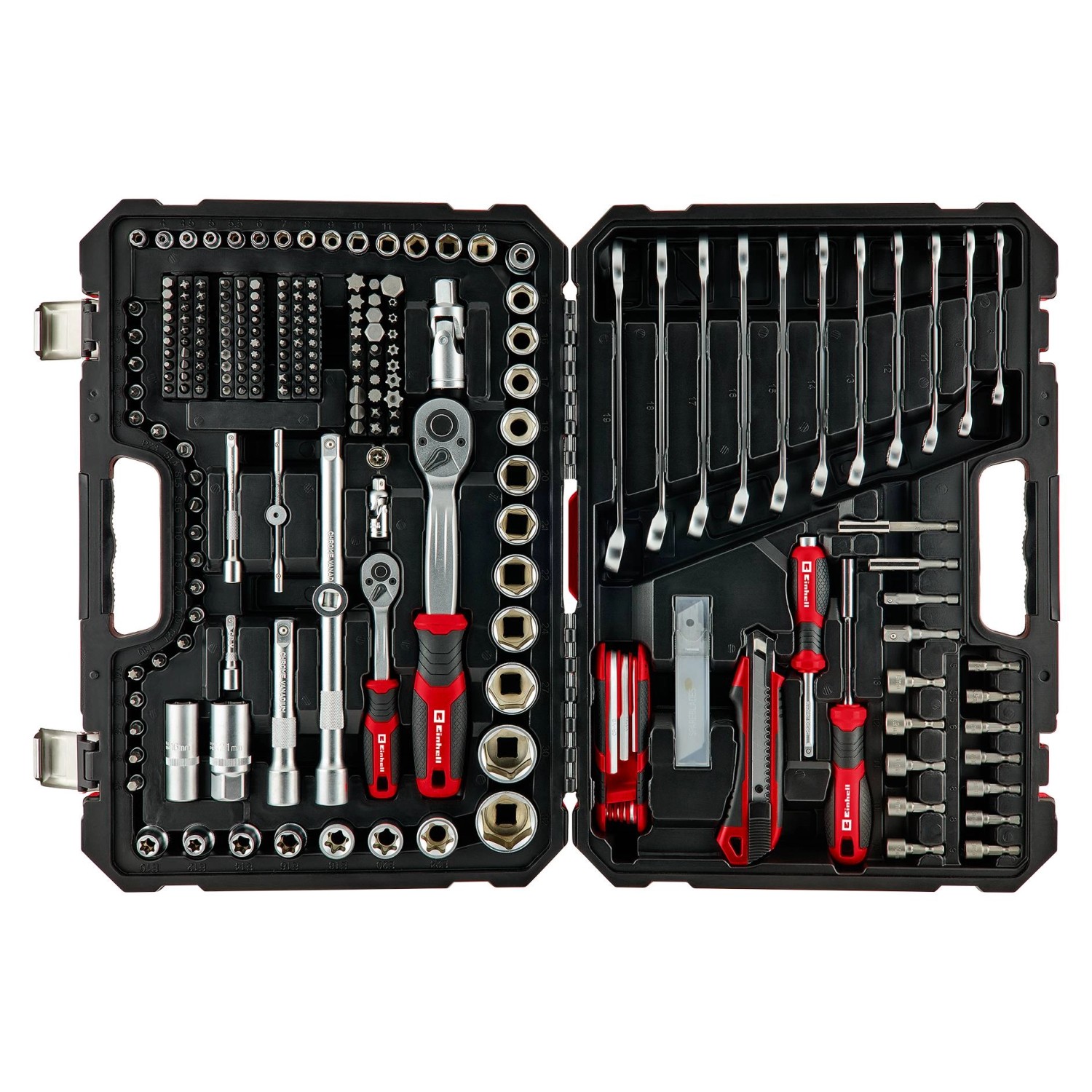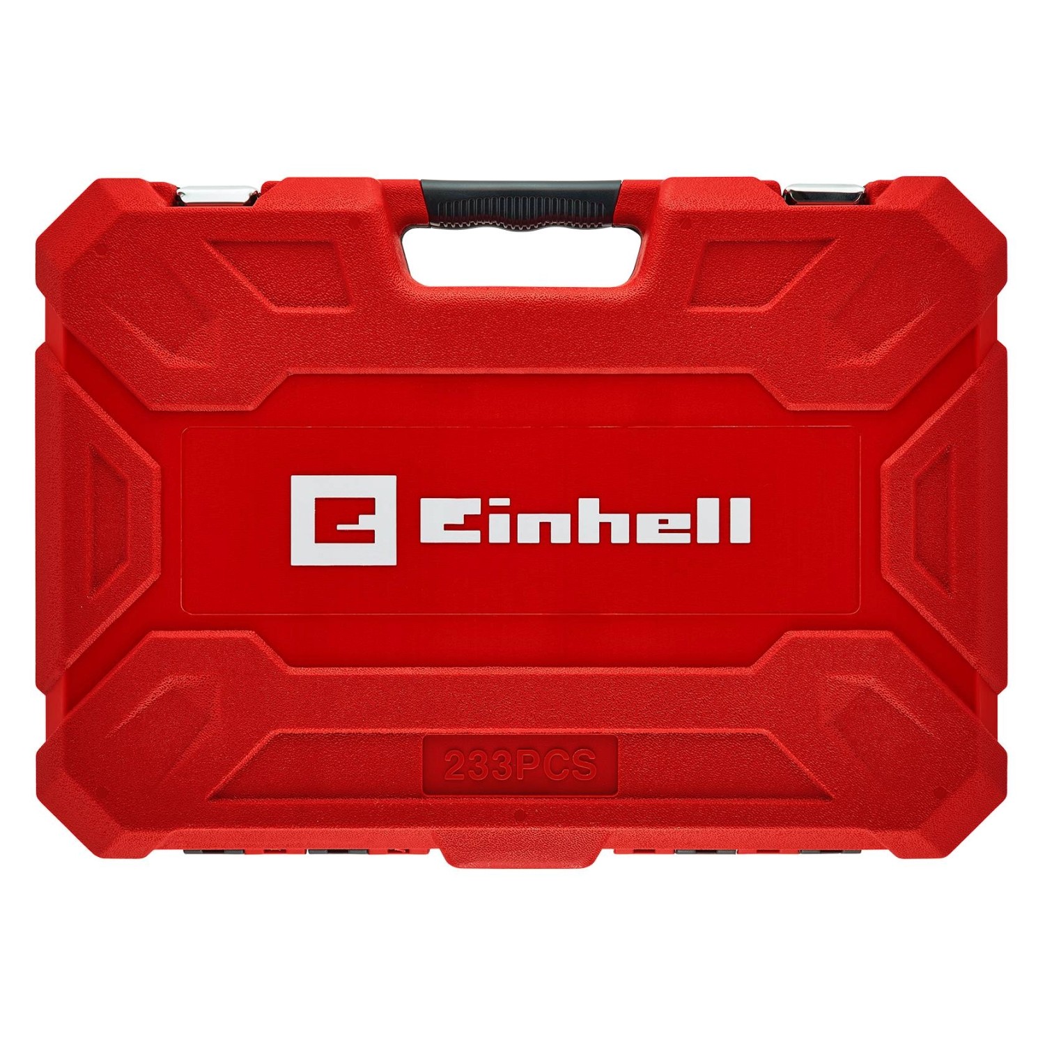 Az Einhell 233 darabos, 46 cm x 33 cm x 9,6 cm méretű szerszámos ládája strapabíró műanyagból készült, két rekeszből áll és két matt ezüst fémcsattal zárható. A láda erős piros színű, belső része fekete, így jól áttekintheti és kontrasztosan látja a szerszámait.