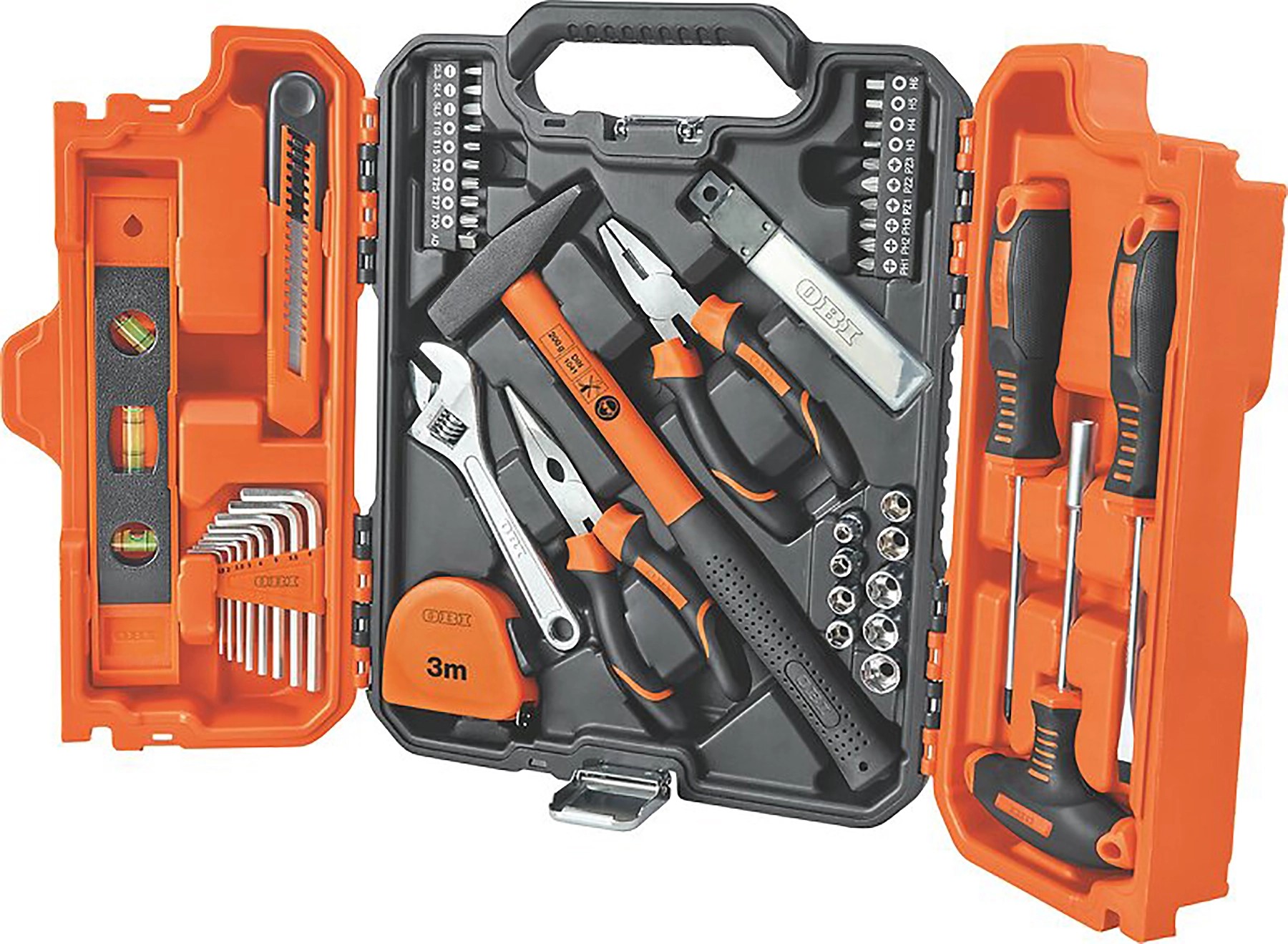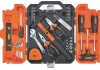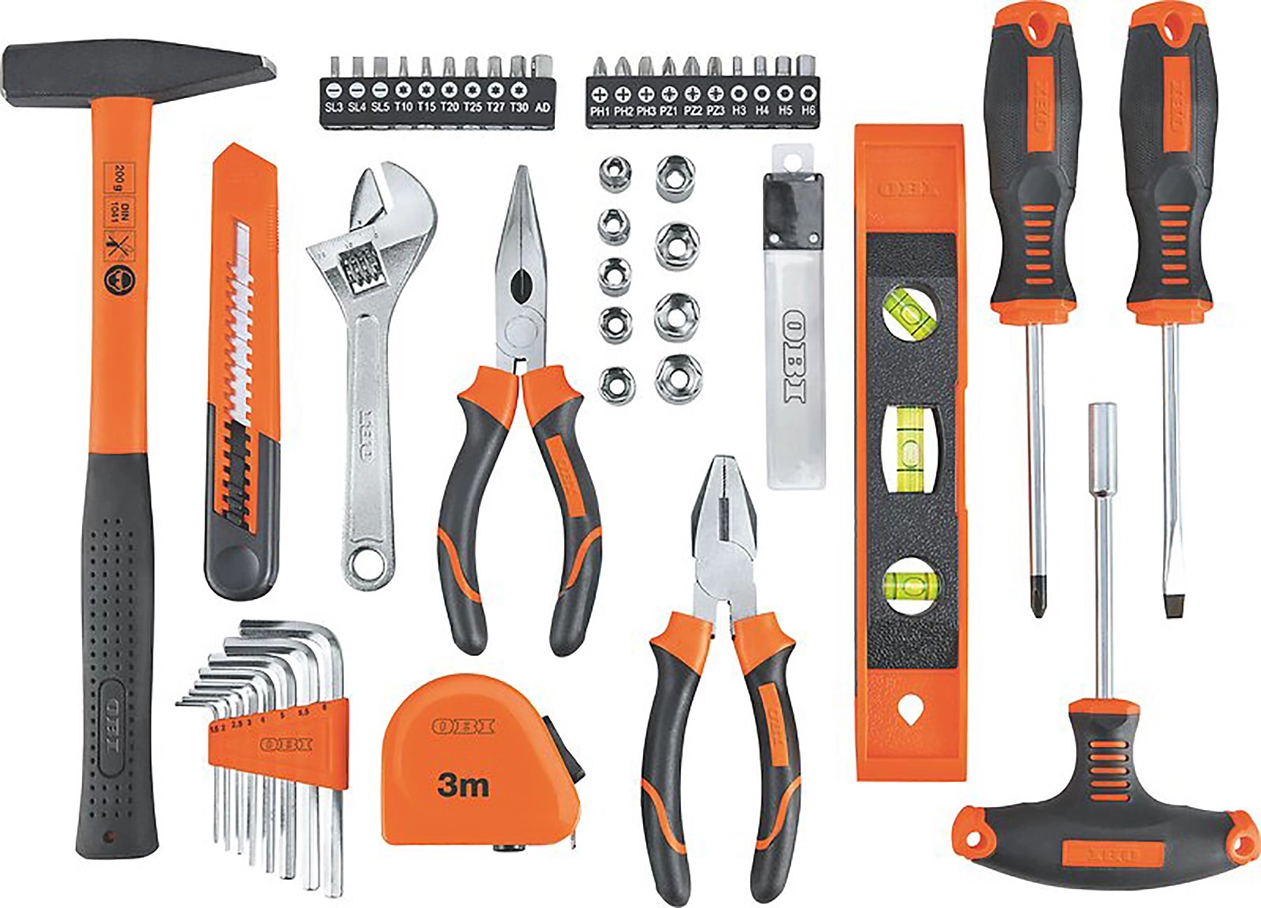 A készlet két csavarhúzót (SL6, PH2) és egy T-markolattal ellátott 1/4"-os bit-csavarhúzót, egy 200 g-os, üvegszálas markolattal ellátott kalapácsot, egy hegyes fogót, egy kombinált fogót és egy 6"/150 mm-es (20 mm) csavarkulcsot tartalmaz. A választékot különböző méretű imbuszkulcsok, dugókulcsok és bitek, egy bitadapter, egy kompakt torpedó vízmérték, egy mérőszalag és egy pótpengékkel rendelkező barkácskés teszi teljessé. A szerszámok és a tartozékok egy fogantyúval ellátott, zárható, narancssárga-fekete műanyag tokban kaphatók, így szerszámai mindig rendezetten és kéznél lesznek.