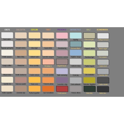 Kiváló minőségű matt, latex emulzió fal- és mennyezetfestésre. A Nagyvilág Színei termékcsalád az egyedülálló Pigment Pro formulának köszönhetően csúcsminőségű pigmentek optimális koncentrációja, mely kivételes fedőképességet, tartós színeket és mosásállóságot biztosít. A szennyeződések, pecsétfoltok könnyen eltávolíthatók megőrizve a fal színét és ideális megjelenését. 56 színben kapható.