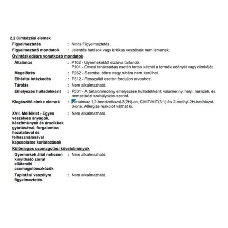 | Alk. gyermekjátékhoz (DIN EN 71-3 bevizsg.): | Gyermekjátékhoz nem alkalmas |