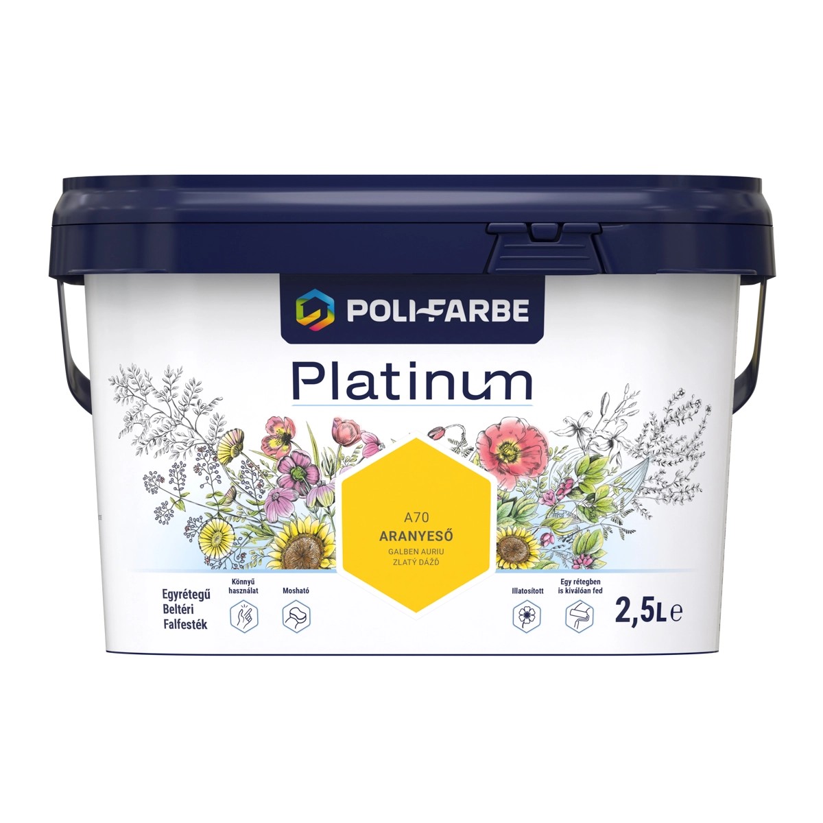Aranyesőszínű, 2,5 l-es Platinum beltéri falfesték újonnan vakolt felületek, régi, festett felületek, valamint gipszkarton és tapéta felületkezeléséhez. Tartós, matt bevonatot képez és egyszerűen tisztítható. Szükség esetén max. 10 %-ban vízzel higítható,