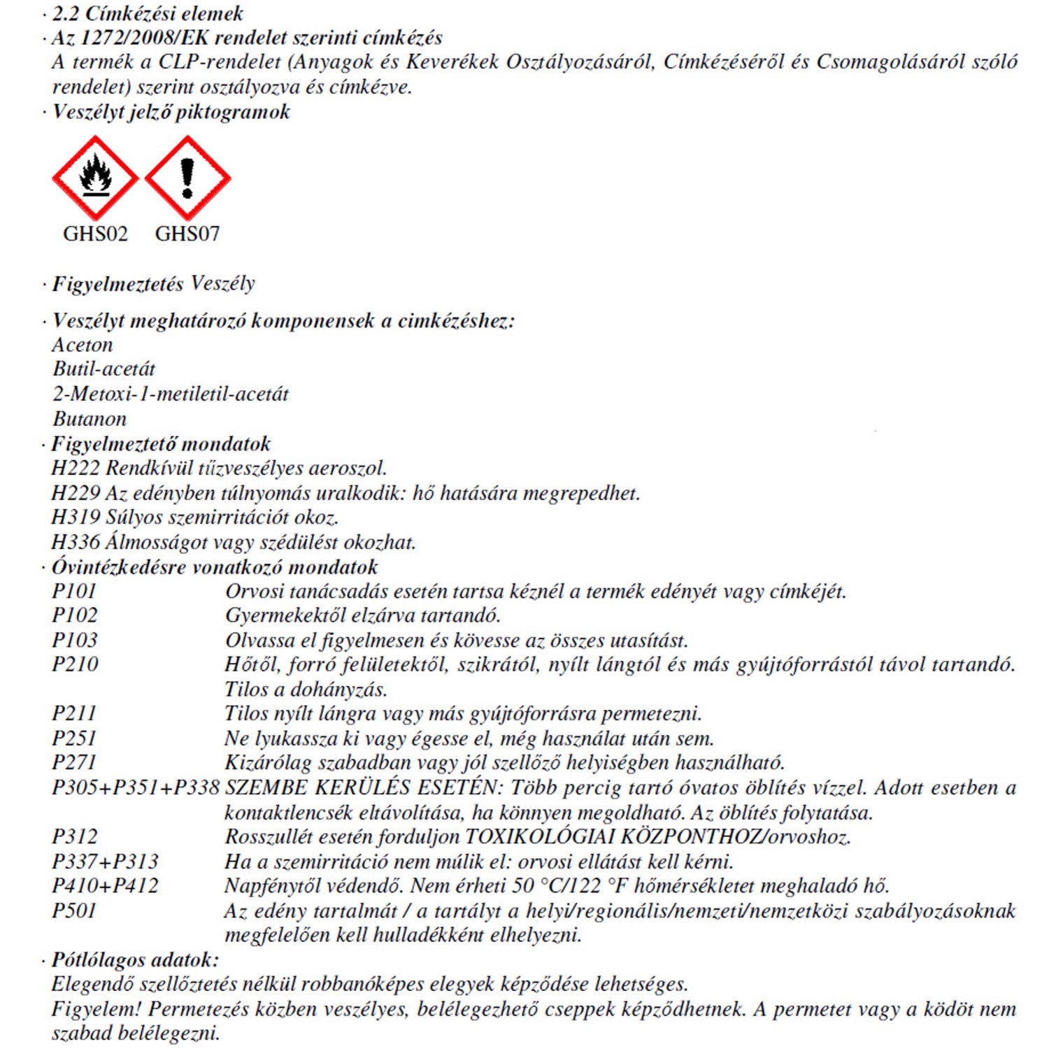 Tájékoztató: Kiváló minőségű műgyanta kombinációs bázisú szórófesték egyedi Rallyestyle festéshez valamint kontraszt- és réteges festéshez. Fémhez, lemezhez és festhető műanyagokhoz, pl. karosszériacsíkokhoz, lökhárítókhoz, felnikhez ideális. Az alapfelületnek teherbírónak, tisztának, száraznak, viasz-, rozsda- és zsírmentesnek kell lennie. A palackot alaposan rázza fel (legalább 2 percig). Próbaszórással ellenőrizze az összeférhetőséget és a színárnyalatot. A festéket keresztben szórja fel. Szórási távolság kb. 25 cm. Feldolgozási hőmérséklet +15-25°C. Használat után a palackot fordítsa a szórófejjel lefelé, és a hajtógázzal fújja ki a szelepet. Porszáraz kb. 10 perc után, érintés-száraz kb. 15-20 perc után, bármikor átfesthető, kb. 60 perc múlva szerelhető.