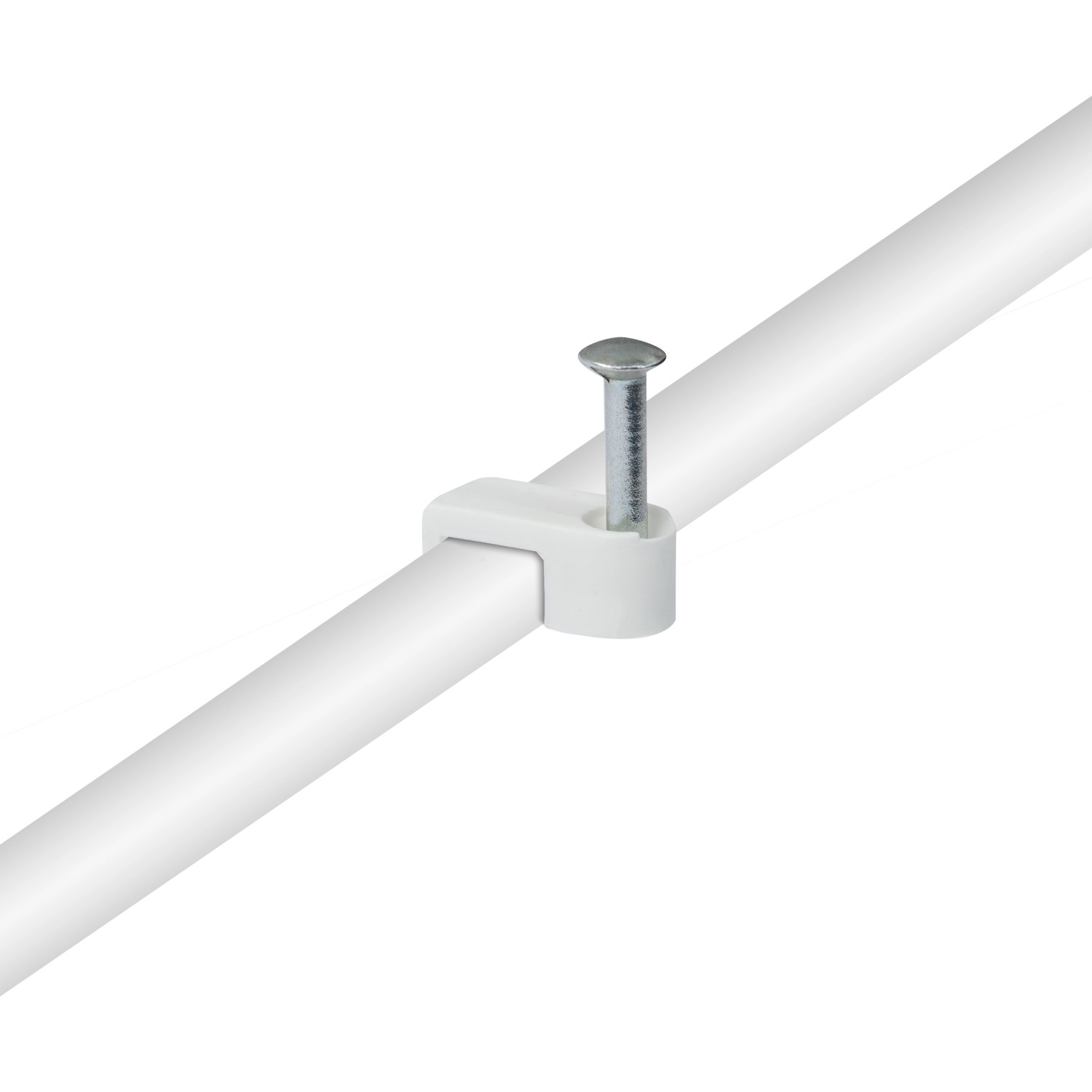 A fehér színű LUX-TOOLS nejlonszálas kábelbilincs 2 mm - 4 mm átmérőjű vezetékekhez használható. Falon kívüli szerelési munkákhoz és lapos vezetékek fára vagy falazatra történő rögzítéséhez használható. Behelyezett szeggel együtt, a szeg mérete: 18 mm x 1