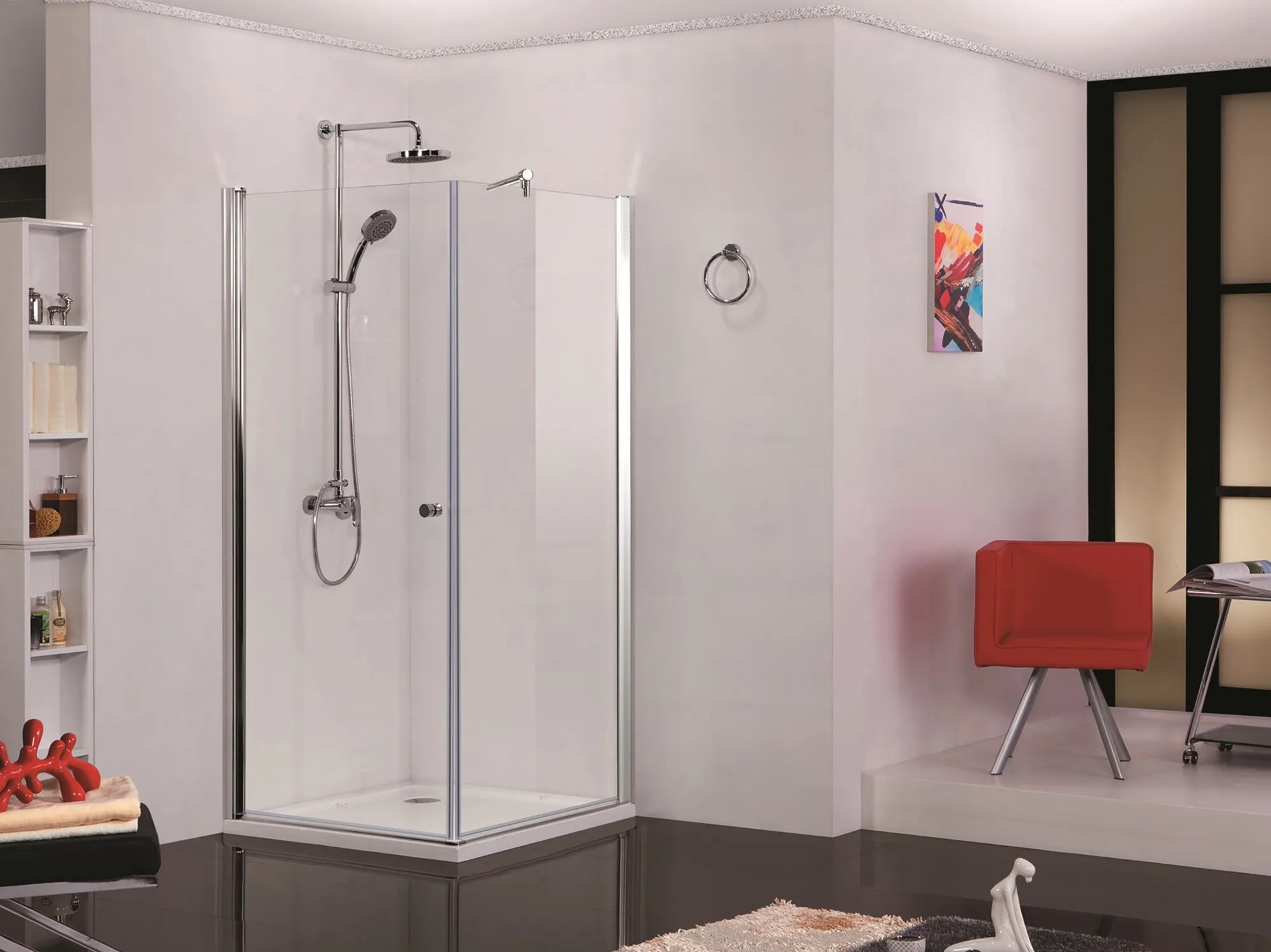Elegance sarokkabin nyílóajtóval, króm profilokkal, 6 mm vastag biztonsági üveggel, zuhanytálca nélkül.