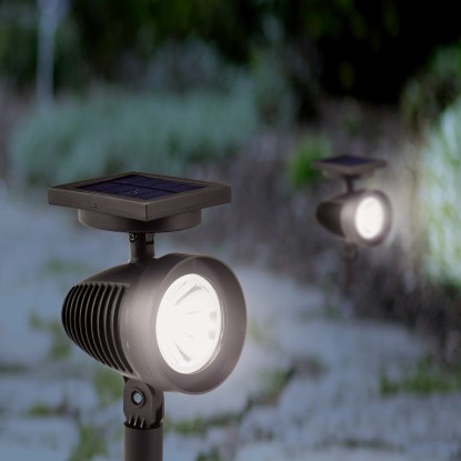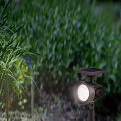 A Trimo LED-es napelemes spotlámpa különösen dekoratív fénypont, amely sötétedés után romantikus fényt áraszt a kertjében. Világítsa meg és helyezze ügyesen reflektorfénybe a napelemes lámpával a növénykompozíciókat, a kerti szökőkutat vagy a dekoratív kerti figurákat.