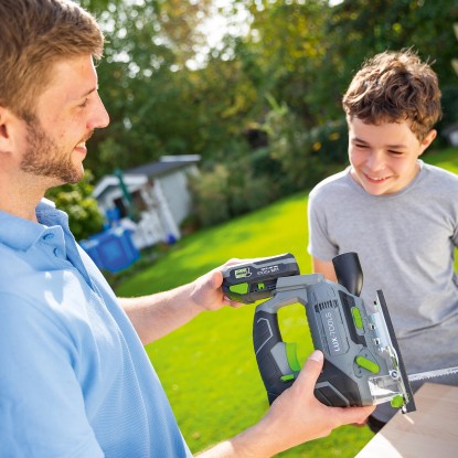 Az akkumulátoros dekopírfűrész a LUX praktikus 1 PowerSystem rendszerének része, és a sorozat kiváló minőségű 20 V-os (18 V névleges feszültségű) lítium-ion akkumulátoraival működtethető. A kívánt akkumulátort külön-külön is beszerezheti 2 Ah-s vagy 4 Ah-s változatban.Egy akkumulátor - két világ: Az 1 PowerSystem