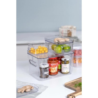 A Compact Access a nyitott előlapnak köszönhetően könnyű hozzáférést biztosít a tartalomhoz. Úgy tervezték, hogy a tárolóhely maximalizálása érdekében több rétegben tárolható legyen. Hűtőszekrényben, polcokon vagy szekrényekben. Vagy építsen egy praktikus kis tárolótornyot a munkalapon, ahol több függőleges hely lesz, ha több, fedéllel lefedett tartályt helyez egymásra. Ahhoz, hogy hozzáférjen a tartalomhoz, nem kell levennie a fedelet vagy a tartályt kivennie. A Compact Access rendszerhez a Compact M-fedél illik. Minden Compact termék kiváló minőségű anyagból készül, amely könnyen tisztítható kézzel vagy mosogatógépben. A tartók fedél nélkül egymásba, fedéllel egymásra rakhatók. A fogantyúnak köszönhetően a tartály könnyen felemelhető és mozgatható. A fedelek külön kaphatók. Finnországban készült élelmiszeripari minőségű SAN műanyagból, 20%-ban megújuló alapanyagokból (az ISCC Mass Balance-en keresztül igazoltan).