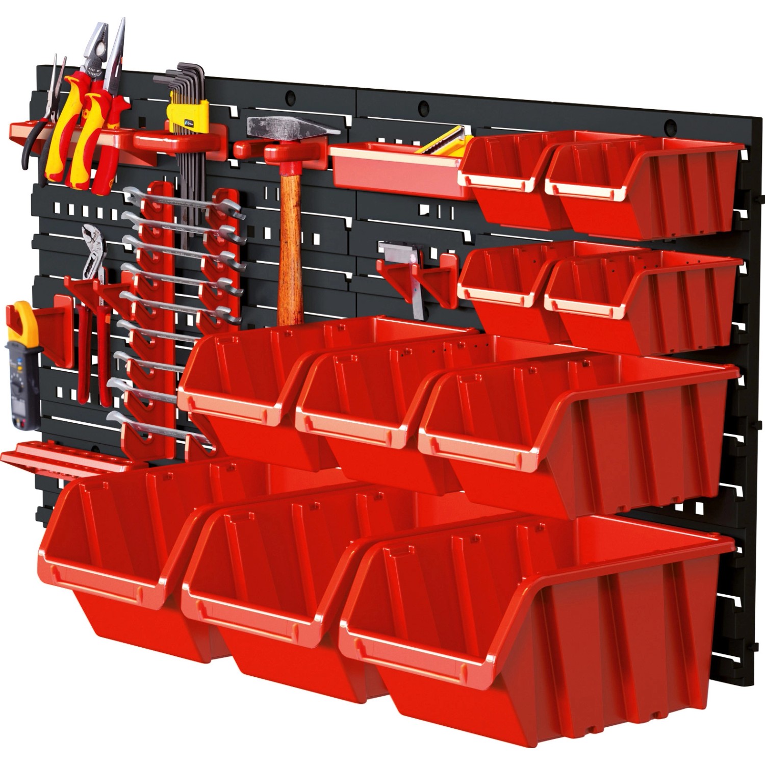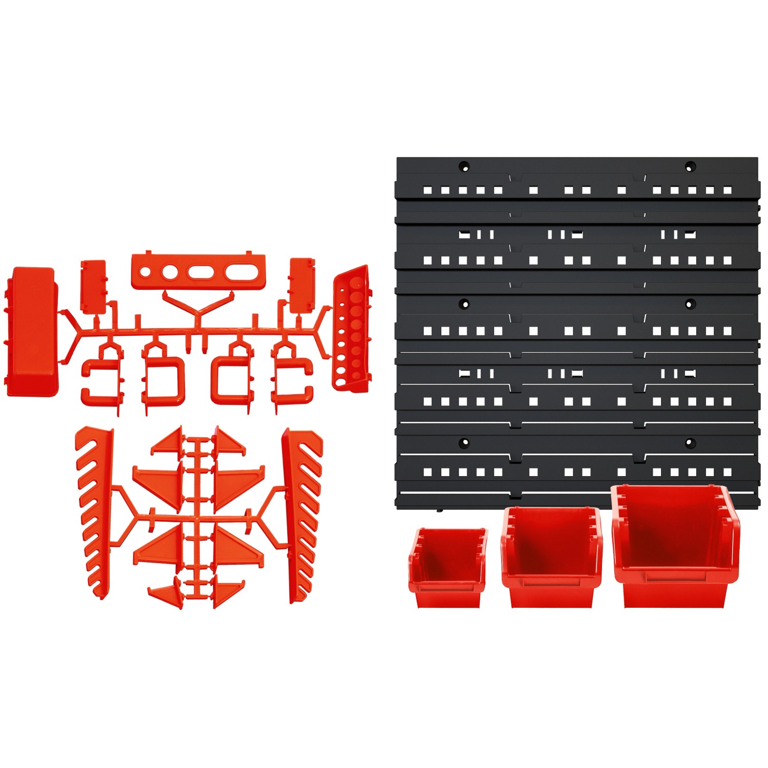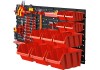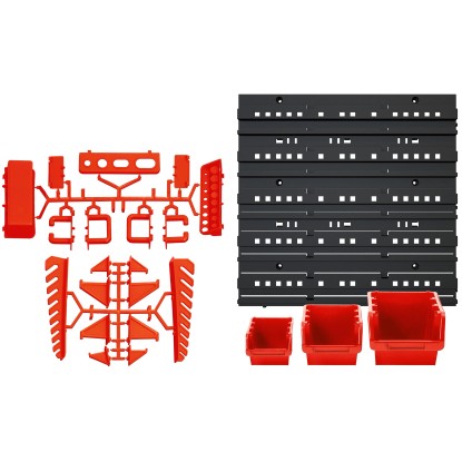 A 45 részes tárolódoboz-készlet szerszámok és kisebb alkatrészek tárolására és szállítására alkalmas. A készlet műanyagból készült.