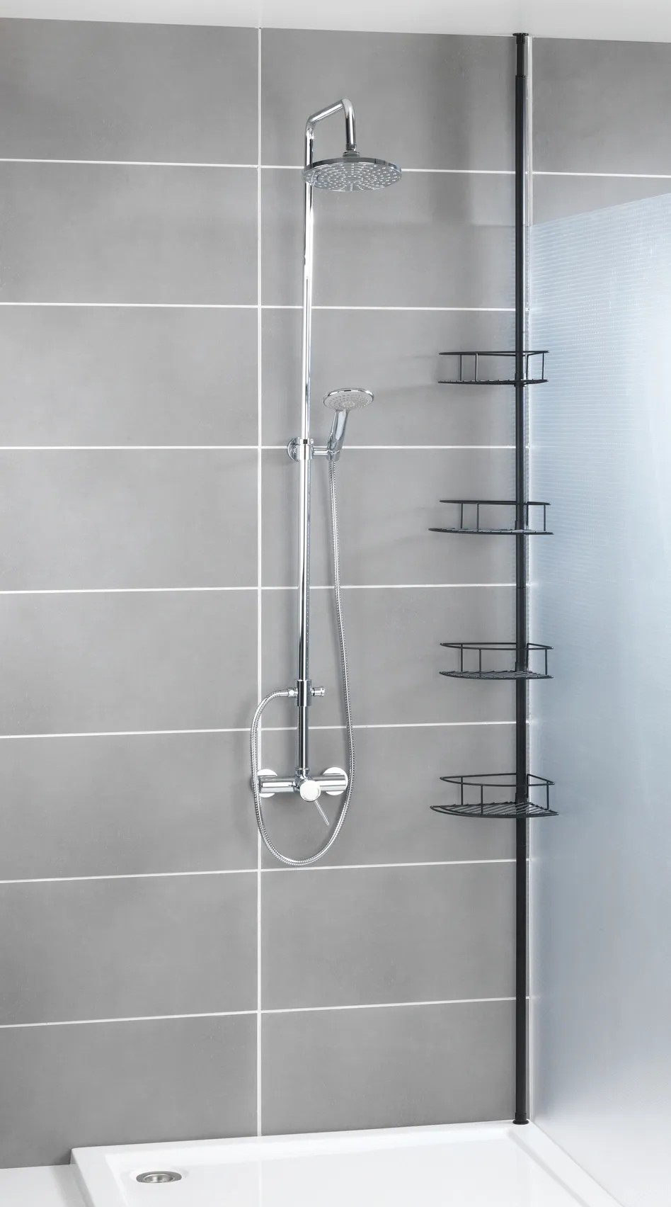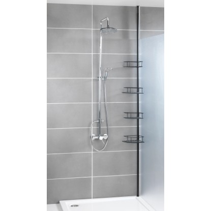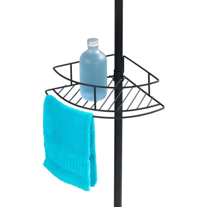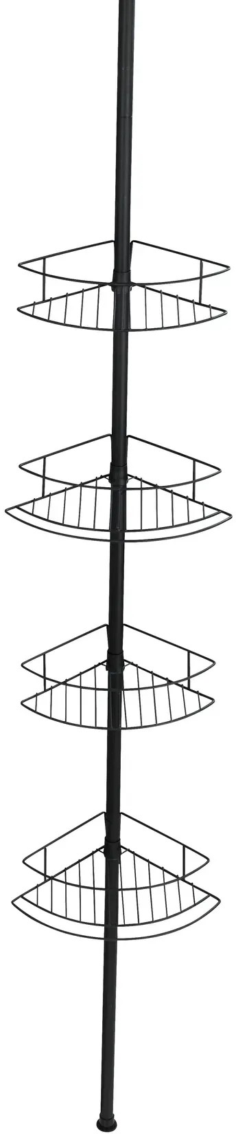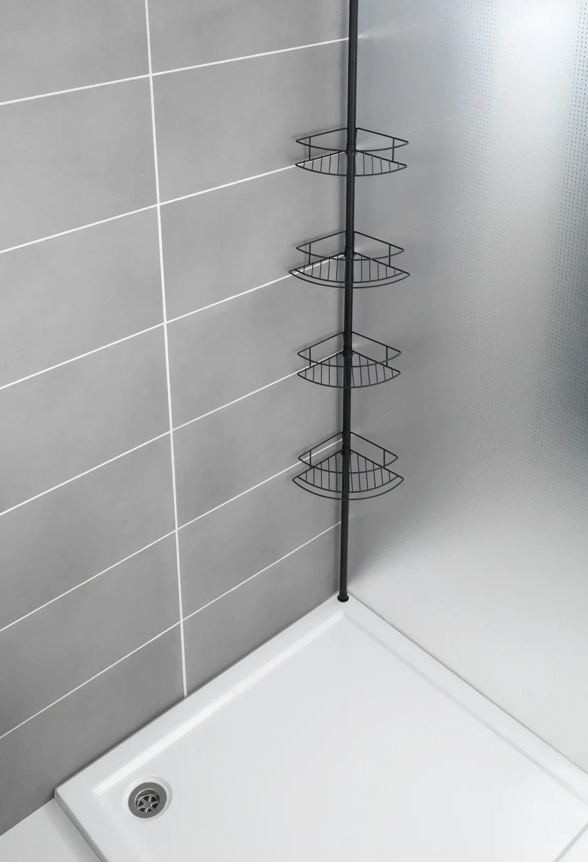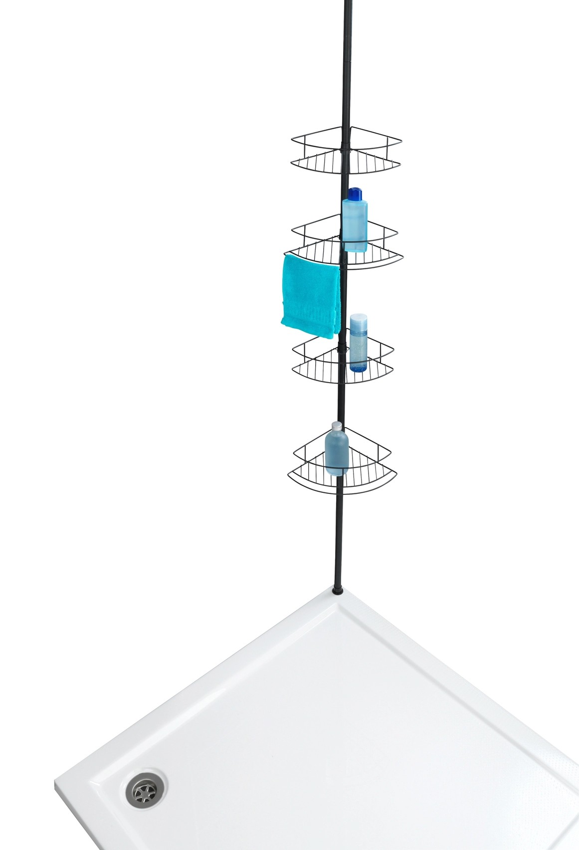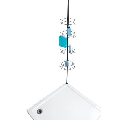 A négy drótkosárral rendelkező praktikus sarokpolc rengeteg tárolási lehetőséget kínál a sampon, zuhanyfürdő, szappan, szivacs és egyéb fürdőszobai eszközök számára. Két kosár további tartóval is rendelkezik a mosdókesztyűk felakasztásához.