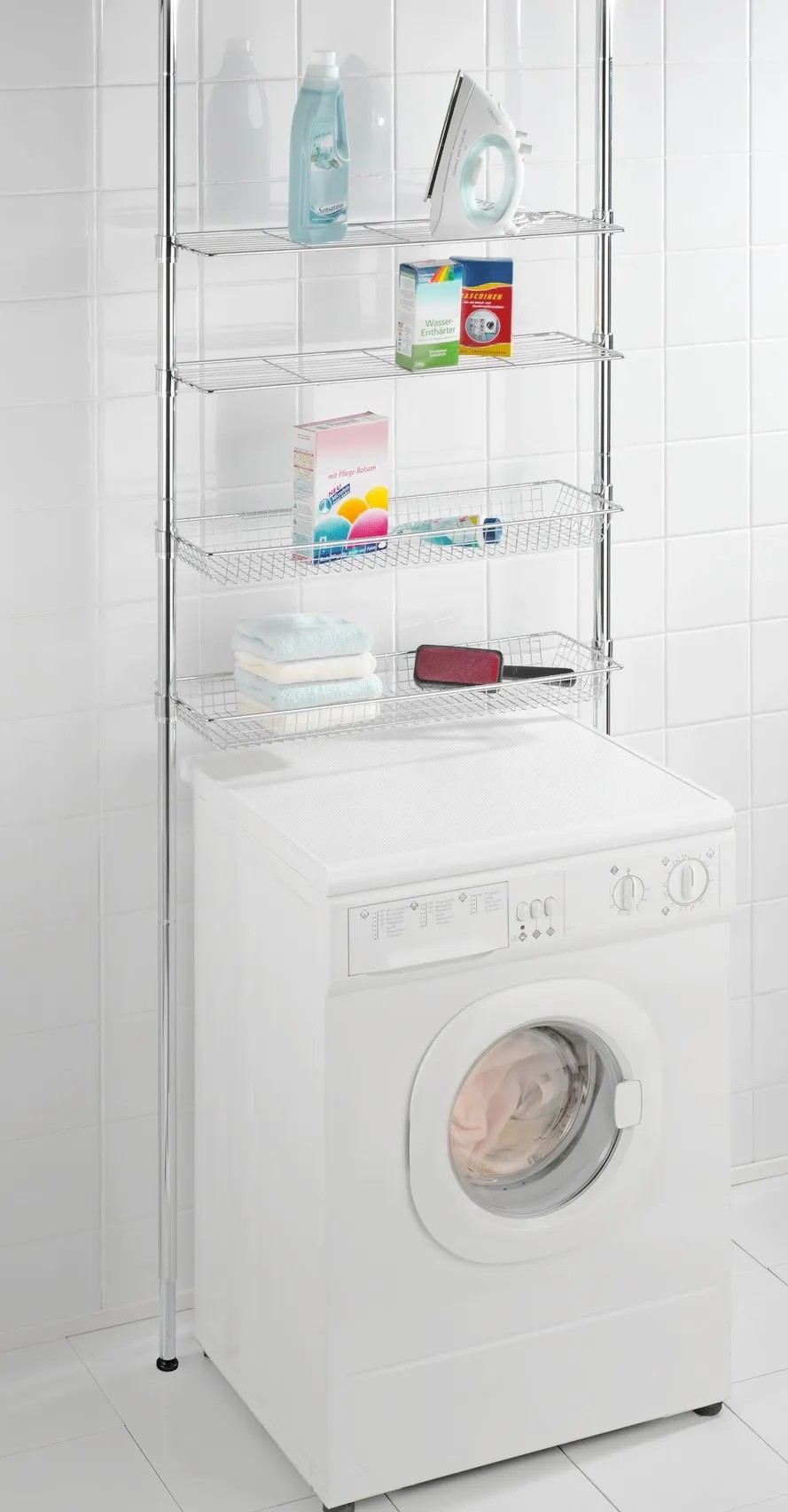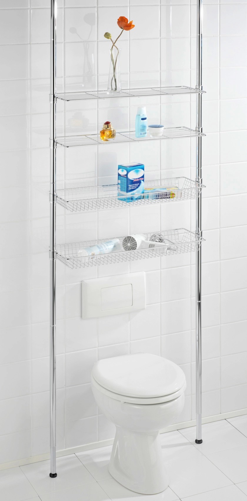 A változtatható teleszkópos rendszer egy csodálatos rendszerező, amely plusz tárolóhelyet teremt a WC, a mosdókagyló, a szárítógép vagy a mosógép felett. Így a fürdőszobai kellékek, kéztörlők és egyéb kiegészítők dekoratív tárolót kapnak.